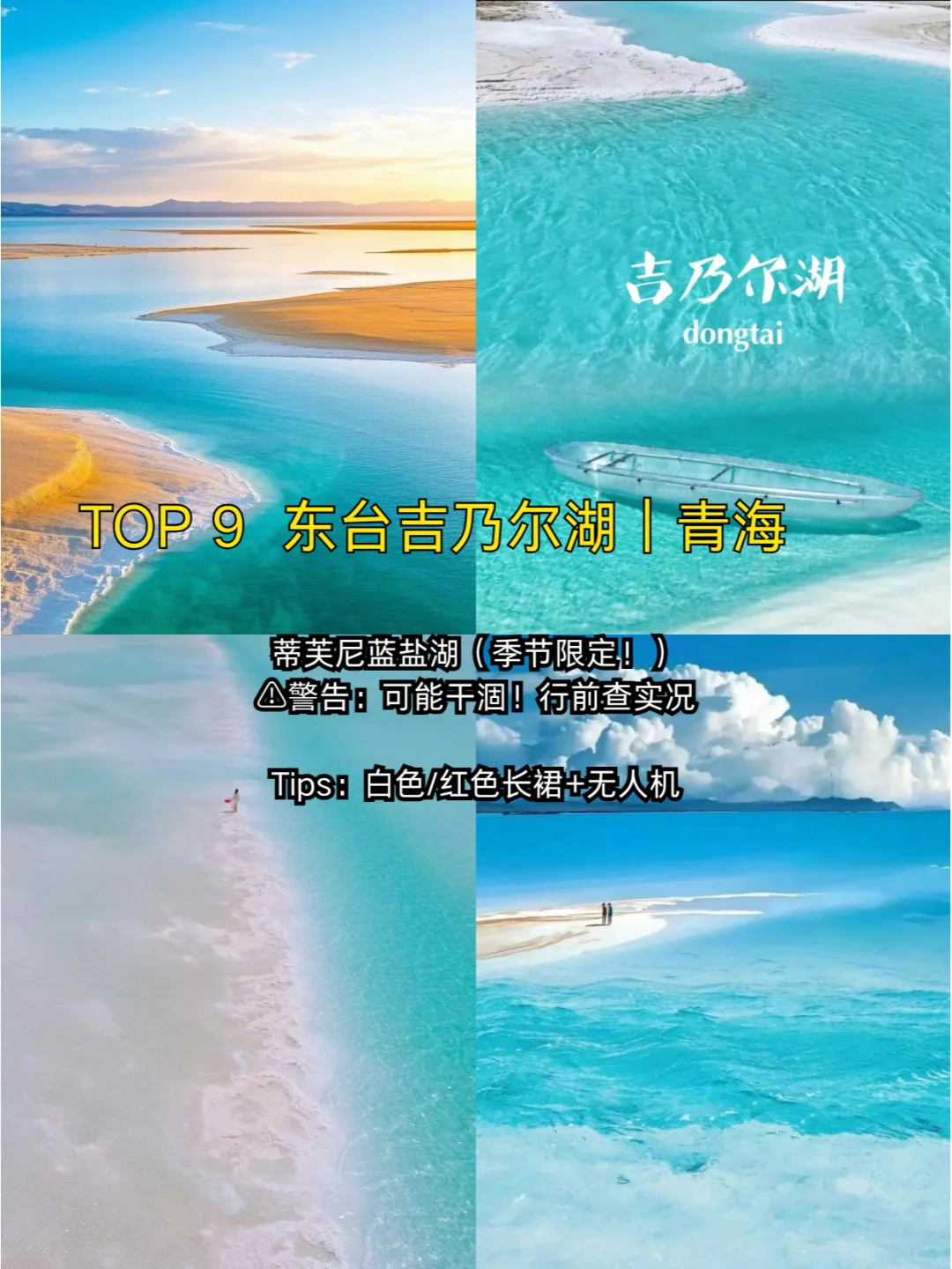 1️⃣ 315国道·大地之血\n“大地之血”位于青海省大柴旦镇境内315国道里程碑757-758公里处,这里河道为矿物质沉淀物形成,呈红色,从上往下看像似大地血管,给人以强烈的视觉冲击。\n \n2️⃣ 315国道·U型公路\n这里绵延数百公里,柏油路面像一条黑色的绸带,飘逸在苍茫的戈壁无人区中,公路随着起伏的地势飞舞,一处处U型路段,仿佛是直指苍穹的天路,被称呼为“中国版的66号公路”。\n \n3️⃣ 张掖·七彩丹霞\n位于中国甘肃省张掖市临泽县,作为全球罕见的丹霞地貌与彩色丘陵的复合区,集雄、险、奇、幽、美于一身,以地貌色彩艳丽、层理交错、造型独特、气势磅礴、场面壮观而称奇。\n \n4️⃣ 长城·嘉峪关\n是我国明代万里长城的西端起点,有“天下第一雄关”的美称,它始建于明洪武五年(公元1372年),距今已有600多年的历史,是明代长城沿线修筑时间最早、建筑规模最为壮观、保存最为完整的一座古代军事关隘。\n \n5️⃣ 敦煌·莫高窟\n坐落在河西走廊西端的敦煌。它始建于十六国的前秦时期,历经十六国、北朝、隋、唐、五代、西夏、元等历代的兴建,是世界上现存规模最大、内容最丰富的佛教艺术地。\n \n6️⃣ 鸣沙山·月牙泉\n月牙泉位于鸣沙山的怀抱之中,它的形状如同一弯新月,泉水荡漾着涟漪,宛如碧翡翠般的清澈。即使在流沙之中,月牙泉也从未干涸,风吹沙尘也无法将其掩埋,这真是一幅奇景。\n \n7️⃣ 大柴旦·翡翠湖\n位于青海省海西蒙古族藏族自治州大柴旦境内,翡翠湖并非自然形成,而是人类多年开采盐湖的结果,湖水在阳光的照耀下清澈湛蓝,闪烁着翡翠般的光芒,因此得名“翡翠湖”。\n \n8️⃣ 海西·茶卡盐湖\n中国最大的天然盐湖之一,位于青海省海西州乌兰县茶卡镇附近,海拔3059米。茶卡盐湖被《国家旅游地理杂志》评为“一生必去的55个地方之一”,被称为中国的“天空之镜”。\n \n9️⃣ 东台·吉乃尔湖\n位于青海格尔木柴达木盆地内,高浓度盐结晶形成的“白色沙滩”,如宝石般清澈透亮的湖水,那深邃而神秘的蒂芙尼蓝色。在阳光的照射下,构成了一幅如梦似幻的画卷。\n \n#大地之血 #U型公路 #七彩丹霞 #嘉峪关 #莫高窟 #鸣沙山月牙泉 #翡翠湖 #茶卡盐湖 #东台吉尔乃湖 #大西北