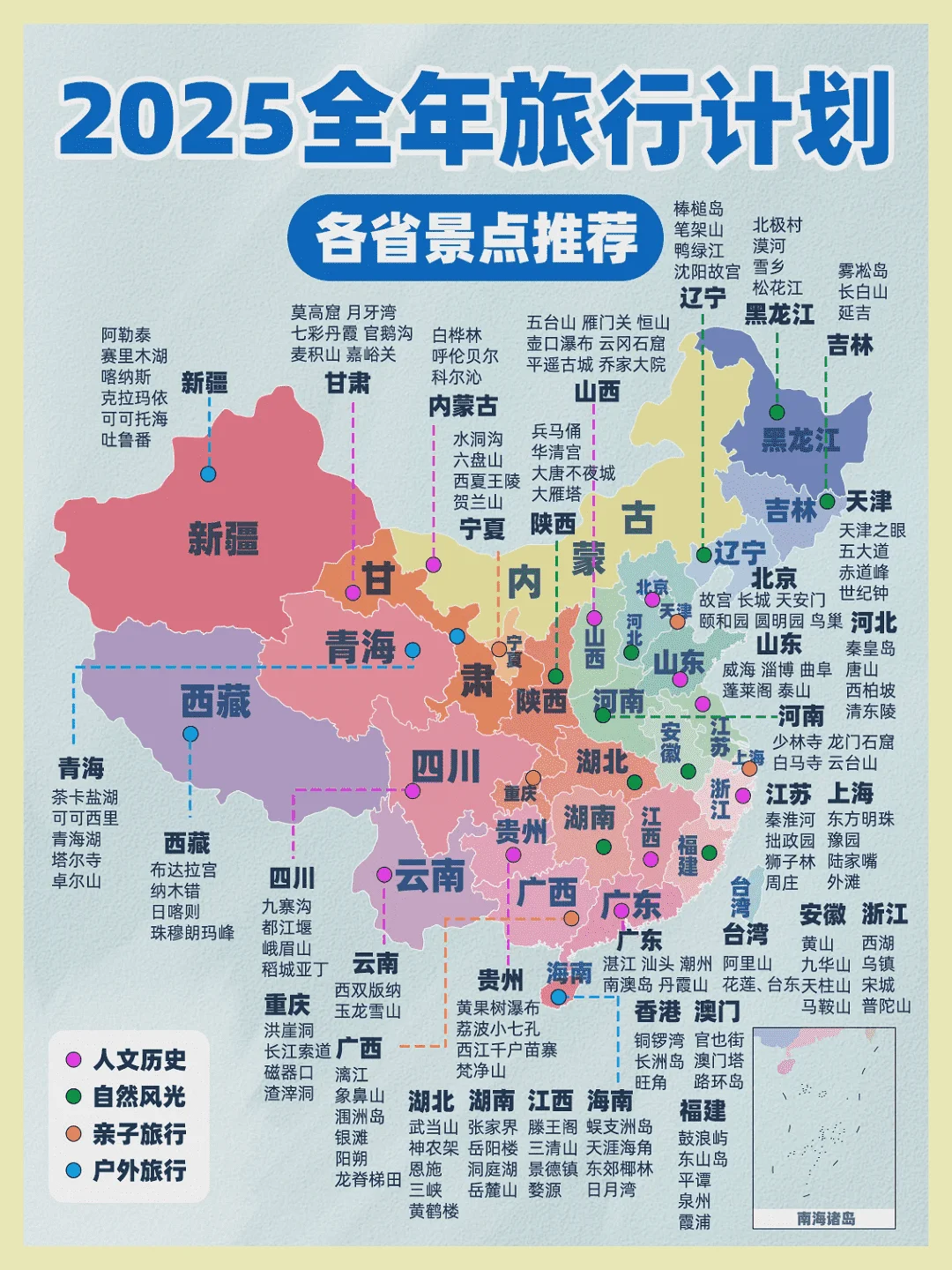 📌【国内9个天花板级景点|无广纯享版!此生必去!】\n✨ 前言\n“山河壮阔,值得奔赴!”\n精选9处震撼级风景,\n人少景美不踩雷,\n附实用干货,收藏这篇就够了!⭐\n🌟 精简版清单\n1️⃣ 长白山天池|吉林\n🔸火山口蓝宝石,7-8月最佳\n✅必玩:北坡登顶+聚龙泉煮蛋\n⚠️注意:天气多变,备厚外套!\n2️⃣ 喀纳斯|新疆\n🔸秋日封神!9-10月层林尽染\n✅必玩:观鱼台全景/月亮湾徒步\n📌Tips:提前办边防证,住新村更安静\n3️⃣ 老君山|河南\n🔸“天上宫阙”云海仙境\n✅夜爬:凌晨3点出发,5点蹲日出\n💰避坑:自带泡面,山顶热水收费\n4️⃣ 稻城亚丁|四川\n🔸眼睛在天堂,身体在地狱\n✅长线:洛绒牛场→牛奶海(6h往返)\n‼️警告:高反严重者慎选长线!\n5️⃣ 赛里木湖|新疆\n🔸四季皆绝色,环湖自驾yyds\n📸出片点:松树头/S弯公路\n🚗推荐:逆时针环湖,错开人流\n6️⃣ 荔波小七孔|贵州\n🔸夏日25℃避暑天花板\n✅路线:西门→卧龙潭→鸳鸯湖划船\n⏰秘诀:早7点入园承包无人山水\n7️⃣ 梅里雪山|云南\n🔸日照金山幸运值MAX\n✅机位:飞来寺/雾浓顶(提前3天看天气)\n🙏禁忌:勿喧哗,尊重藏地信仰\n8️⃣ 扎尕那|甘肃\n🔸隐世藏寨+洛克之路\n✅玩法:仙女滩轻徒步/藏式民宿观星\n🚙交通:SUV优先,山路崎岖\n9️⃣ 东台吉乃尔湖|青海\n🔸蒂芙尼蓝盐湖(季节限定!)\n⚠️警告:可能干涸!行前查实况\n📸穿搭:白色/红色长裙+无人机\n📝 极简攻略\n1️⃣ 高原预警:稻城/梅里备氧气瓶,首日勿洗头\n2️⃣ 交通建议:新疆/青海租车选坦克300,贵州包车更方便\n3️⃣ 错峰秘诀:节假日早6点进景区,下午逛小众点\n4️⃣ 拍照公式:日出后2小时&日落前1小时=黄金光线\n5️⃣ 保命装备:登山杖+防晒霜+冲锋衣,徒步带葡萄糖\n🌈 旅行者说\n“出发永远是最有意义的事”\n这9个地方,\n有的需要勇气,有的需要运气,\n但抵达的那一刻,\n你会明白——\n所有跋涉,皆为值得!\n🌟关🐷我,一起看世界吧~\n#旅行天花板 #无广推荐 #小众旅行 #此生必去 #旅行攻略