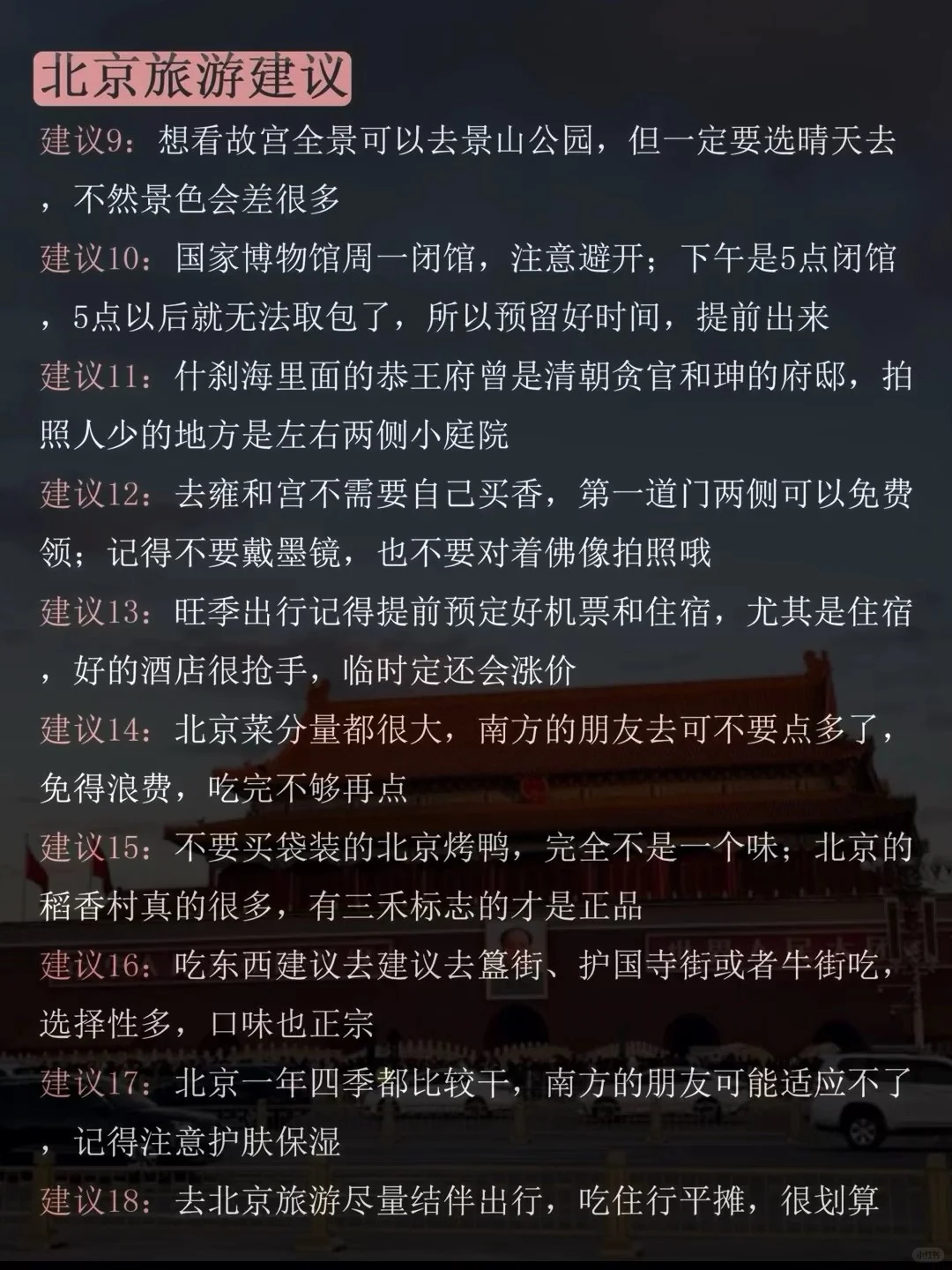北京很多景点不提前预约的话就算来了也进不去,为防止大家白跑一趟,大家记得提前开始预约❗️❗️\n1⃣颐和园 提前七天 晚上21点\n \n2⃣圆明园 提前七天 凌晨24点\n \n3⃣天坛公园 提前七天 凌晨24点\n \n4⃣天安门广场 提前九天 凌晨24点\n \n5⃣天安门城楼 提前七天 下午17点\n \n6⃣国家自然博物馆 提前三天 中午11点\n \n7⃣国家博物馆 提前七天 下午17点\n \n8⃣人民大会堂 提前三天 下午17点\n \n9⃣毛主席纪念堂 提前六天 中午12点30分\n \n🔟故宫博物院 提前七天 晚上20点\n \n1⃣1⃣恭王府 提前十天 晚上20点\n \n1⃣2⃣鸟巢 提前七天 凌晨24点\n \n1⃣3⃣水立方 提前七天 凌晨24点\n \n1⃣4⃣北海公园 提前七天\n \n1⃣5⃣军事博物馆 提前五天\n \n1⃣6⃣雍和宫 提前七天 晚上20点\n \n1⃣7⃣国子监 提前七天 晚上19点\n \n1⃣8⃣科技馆 提前七天 下午18点\n \n1⃣9⃣天文馆 提前三天 下午18点\n \n2⃣0⃣北京大学 工作日提前一天、非工作日提前七天早上8:00\n \n2⃣1⃣清华大学 提前七天 早上8:00\n \n❤ Tips: 北京景点众多,做攻略总会有遗漏,怕麻烦的可以找个靠谱的当地tuan,吃住行门票都能包含,基本不用操心,行程安排得很合理,也没有强制消费。\n图片来源于@Alice ,请勿误判\n#记录吧就现在 #北京旅游 #北京旅游攻略 #北京景点预约 #北京预约 #北京跟团游 #北京旅游打卡