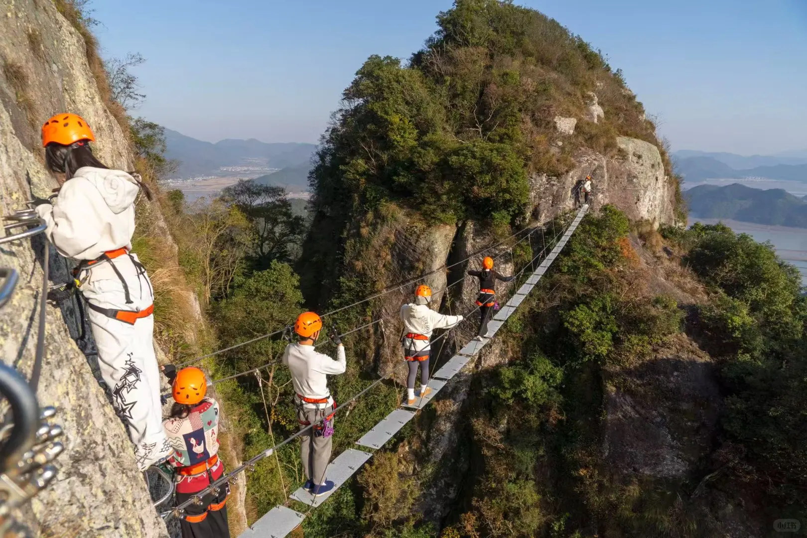 古东瀑布有六级瀑布可以爬,穿上草鞋戴上头盔,手抓铁链脚踩石坑沿着瀑布往上攀爬,感受水花四溅的刺激。爬完瀑布累了还可以喝个咖啡,接着走过吊桥,俯瞰脚下美景,再坐溜索滑道下山,一路风驰电掣,享受速度与激情。