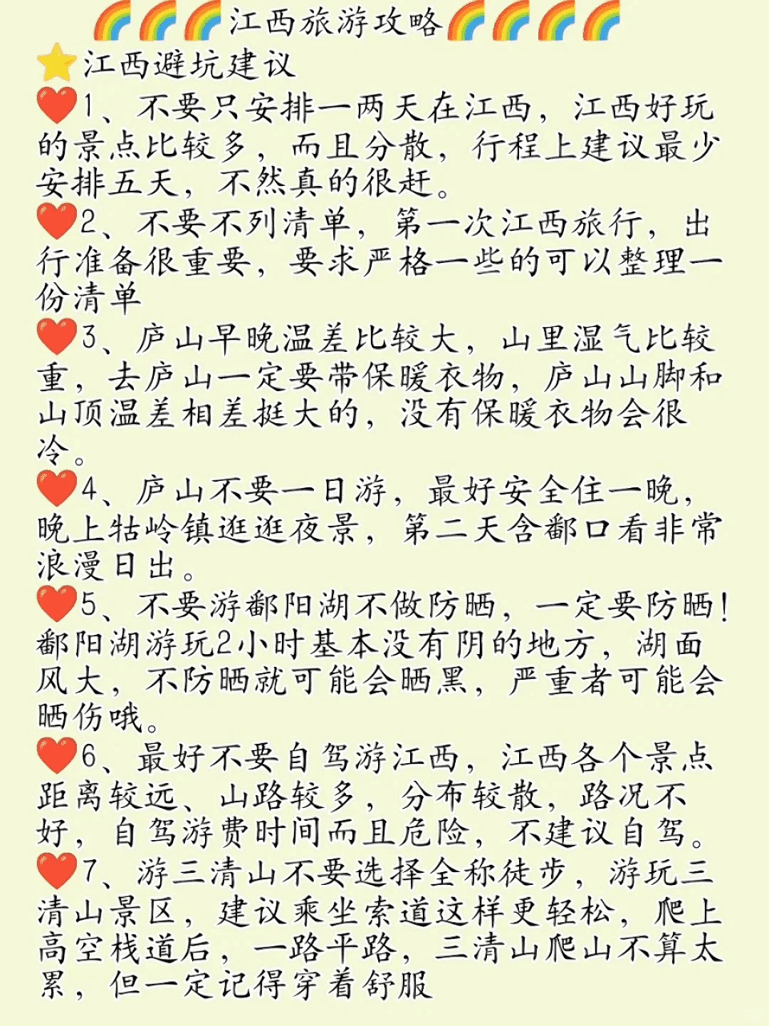 首次踏足江西的姐妹们,务必收藏这篇攻略,助你避雷防坑!\n穿搭建议:\n江西气候宜人,不冷不热,但早晚温差较大。建议携带外套、长袖、长裤、裙子及遮阳帽等。若计划在三清山或庐山山顶住宿,记得带上外套哦。\n住宿推荐:\n婺源住宿:建议选择县城宾馆,住宿条件优越,且前往东线北线均十分便捷。篁岭民宿虽别具风情,但交通不便,山里设施一般。\n景德镇住宿:人民广场附近是不错之选,市内交通四通八达。\n庐山住宿:牯岭镇会议中心周边住宿餐饮众多,还有温泉酒店可供挑选,不妨在平台上搜索比较。\n南昌住宿:红谷滩万达附近值得考虑,距离滕王阁秋水广场近,酒店新颖且交通便捷。\n游玩建议:\n跟团游:若计划游玩4-5天,跟当地团是个明智之选,既方便又能深度游览景点。跟团无需担心门票预约购买,省心省力!\n自由行:若时间有限,仅一两天的话,可选择自由行,逛一两个精华景点也是不错的选择。不过出发前仍需简单规划一番。\n必打卡景点:\n1. 篁岭:建于明代中叶,已有500多年历史。篁岭梯田翠绿层层,云雾缭绕,被誉为“梯云人家”。\n2. 庐山风景名胜区:苏轼诗句“不识庐山真面目,只缘身在此山中”使其声名远扬。\n3. 江岭景区:春暖花开时,漫步江岭万亩梯田,仿佛置身于天人合一的画卷之中。\n4. 滕王阁:临赣江而立,因《滕王阁序》而闻名遐迩,是“江南三大名楼”之一。\n5. 三清山:有“小黄山”之称,自然风光绝美,道教人文景观独具特色。\n5天4晚行程规划:\n1日:各地启程赴江西\n2日:世界文化遗产庐山之旅美庐别墅、如琴湖、花径、锦绣谷、天桥、仙人洞、御碑亭、庐山会议旧址\n3日:鄱阳湖与景德镇世界非物质文化遗产陶瓷创意园之行\n4日:景德镇名坊园与月亮湾梦里老家演绎小镇之旅\n5日:江南小布拉宫篁岭景区及篁岭晒秋体验之旅\n小贴士:江西景点众多且分布较散(去过的都懂),首次前往的小伙伴若想省时省力省钱,不妨考虑报个当地团。人均仅需1000元,景点精华尽收眼底,住宿条件也不错,性价比超高哦!#江西旅游攻略 #江西旅行攻略