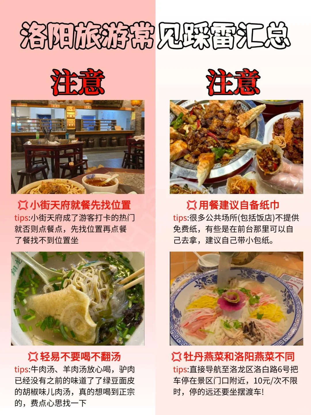 1️⃣中午先去了✅白马寺✅,中国第一古刹,强推真的很好逛就是离市区还挺远的很偏(公交50min),门票35r,里面有中国,印度,缅甸,泰国四国风格佛殿的国际化寺院!大概逛了一个小时真的很好玩!里面还有一个免费茶水的地方但一定要保持安静。门口有很多卖小马手串的店铺可以看看,还有老酸奶但感觉味道都差不多。然后又去了✅洛阳古墓博物馆,提前预约不需要门票,位置比较偏,把各种古墓放进博物馆实景展示的形式相当独特!非常值得去看。晚上先去了✅明堂天堂,门票90r,就在门口看了一眼夜景很漂亮!旁边就是✅应天门,广场是免费的,上二楼门票60r,应天门是朝廷举行登基,改元,大赦,宴会等外朝大典的场所,武则天在此登基称帝,超级气派的建筑!晚上又去了✅洛邑古城,不需要门票,感觉人还挺少的没有什么商铺。里面还有一个文峰塔。\n2️⃣第二天中午去了\n✅龙门石窟,门票90r。中国四大石窟之一。离市区有点远。里面还是蛮大的大概逛了两个小时。夜游好像开放了可以去看看。分为四个小景区,有些需要爬山的哦。\n✅丽景门,从十字街到丽景门那条路上也很高逛的,也像个夜市一样,丽景门其实就是个城楼,不需要买票进去拍照打卡即可。晚上又去洛邑古城逛了下。\n舌尖上的洛阳\n🌺一记洛阳菜\n洛阳30年老店,招牌糖醋小排必点,狮子头可以尝尝,点一个就🉑,纯肉丸儿啊!水席虽不是他家的招牌,但真的好吃啊!我很喜欢洛阳水席的酸辣,连汤肉片推荐尝尝,他家针对游客推出很多文创菜品,好吃又好拍,还能免费喝海碧!\n🌺阿玲新豫菜\n个人建议来洛阳啥都可以错过,唯独这家一定不能少!都是河南硬菜,服务特别热情,卤蛋烧牛腩量很大,味道正宗,还有里面的风味羊排,一个接一个,停不下来👍,必吃黄河大鲤鱼,硬菜啊!一定要点根油条浸泡在鱼汤里,吸满汤汁的油条绝了😋,吃鱼还送胸针,蛮精致的🤩\n🌺豫味坊(洛邑古城店)\n在洛阳吃腻了汤汤水水?来豫味坊解锁豫菜新体验!招牌酥皮胡辣汤申请专利吧?酥皮蘸汤香到灵魂出窍!水席焦炸丸子“有声版”上桌,凉粉炒米粒粒分明超弹牙。环境像艺术馆但价格超接地气,汉服小姐姐会帮你拌汤。逛完洛邑古城来这打卡,很推荐!\n#洛阳糖醋小排 #洛阳旅游 #洛阳美食 #来洛阳看牡丹花 #洛邑古城#新豫菜 #洛阳亲子游