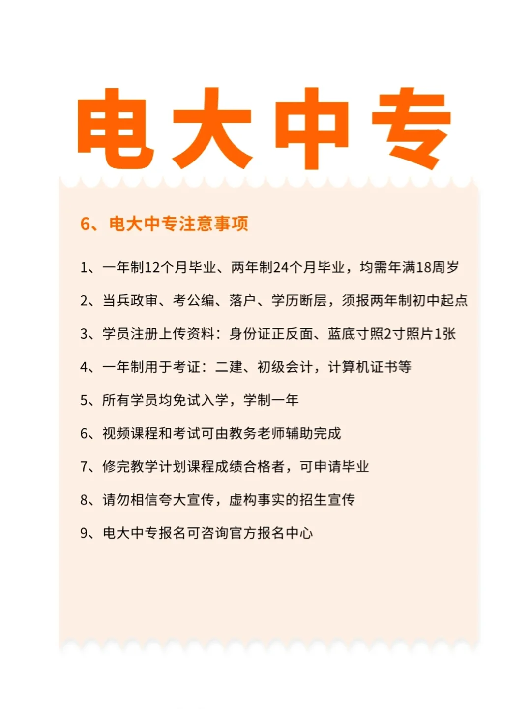 😎宝子们,今天我来给大家分享超详细的【一年通关电大中专全攻略】,零基础也能逆袭哦,还有时间表和避坑指南呢🧐\n🤔备考电大中专拿证实际只需要12个月哦。哪些人适合呢?像那些要考证、升大专或者想解决学历断层的职场小伙伴就很适用啦👍\n💥先来说说报名筹备期(1 - 3天),这个阶段任务满满呢。\n📌学历核验方面,前置学历要确认好哦,高中或者中专毕业证原件要准备好备查。要是丢了也别怕,联系报名点开个《学历遗失声明》就好啦😉\n📌材料准备也不难。身份证正反扫描件用手机扫描APP就能搞定,蓝底证件照记得穿深色上衣在白墙前面拍哦,还有实名手机号,建议用常用的号码🧐\n📌选专业也有技巧哦。考证热门的有建筑工程施工、计算机应用、会计事务这些;考公刚需的话,法律事务、行政管理(这个得是两年制的)就很不错;要是医疗方向的,药剂、中药(需要配合相关工作经验)可以考虑呢🔥\n📌缴费的时候要小心呀。私人微信收款的99%是骗子,可别上当。1180元分两次付,注册付600元,出学籍再补580元哦😎\n🌟然后就是学籍激活期(3 - 5天)啦。\n🔍关键动作就是每天登录“中央电中”官网查学籍,还有领取学习账号,这可不能忘呀🤗\n📚课程攻坚期(第1 - 10个月)来咯。\n⏳学习方案可以自己学,要是觉得有困难,也可以让教务老师辅助完成呢😉\n🎓毕业冲刺期(第11 - 12个月)可是很关键的哦。\n🚀收官必做的事不少呢。要登录平台确认总课时≥105小时,检查所有考试状态显示“已通过”,提交毕业申请表,邮寄地址建议填单位地址,这样能防止丢件哦🧐\n⚠️这里还有避雷警报呢。“加急拿证”的骗局可别信,教育部规定至少12个月才能拿证。拒绝二次收费,一年制1180元,两年制1380元,不会有其他额外费用的。查证的时候只认“中央广播电视中等专业学校”公章哦😎\n📌要是需要各专业考证资料,点击商品找到客服就行啦。建筑工程施工(需要实操基础)、计算机应用(办公软件操作)、电子商务(理论偏多)、老年人服务与管理(最简单)这些专业都有呢。\n宝子们,你们觉得这个攻略有没有用呢🧐🤔 #电大中专 #盛世19年的通关秘诀 #攻略 #零基础\n#电大中专 #盛世19年的通关秘诀 #攻略 #零基础