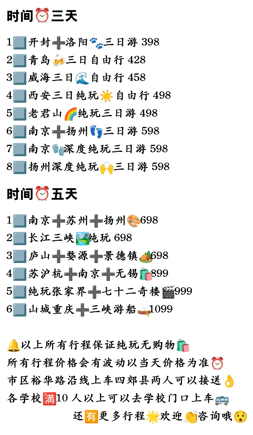 天津清明节海棠花开🌸\n🌞气候也刚刚好超级适合citywalk\n·\n📅三日行程总览\n✨Day1:津味文化初体验\n世纪钟广场→意大利风情区→古文化街→鼓楼→天津之眼\n✨Day2:万国建筑与海河浪漫\n五大道→西开教堂→瓷房子→张学良故居→海河游船\n✨Day3:春日限定与小众打卡\n花朵盛开的公园→杨议美术馆→武清贻笑坊相声茶馆\n·\n🔍详细行程 ➕ 玩法\n📍Day1\n8:00 世纪钟广场\n天津地标机械钟,海河晨曦📸拍照超出片,10 分钟速战速决。\n9:00 意大利风情区\n免费的欧洲小镇,推荐威尼斯意餐吧露台喝咖啡☕,拍 ins 风拱门照(避开旅行团高峰 9:30 前到)。\n11:00 古文化街\n✅必吃:熟梨糕(陆记老号)、果仁张、崩豆张\n❌避雷:狗不理包子(本地人推荐老胜香)\n🎁伴手礼:泥人张彩塑、杨柳青年画\n14:00 鼓楼 + 广东会馆\n登鼓楼俯瞰老城厢,广东会馆听👂🏻京剧(下午场 15:00,10 元坐小马扎体验)。\n18:30 天津之眼\n提前 1 天公众号预约(70 元 / 人)❗选 19:00 场次,落日 + 夜景双收!恐高者可在永乐桥底拍全景。\n \n📍Day2\n8:30 五大道\n租自行车(20 元 / 小时)逛 “万国博览苑”,重点拍民园体育场(罗马柱🏛️ + 环形跑道)、庆王府(门票 20 元)。\n10:30 西开教堂⛪\n粉色塔楼 + 彩绘玻璃,周末弥撒时间(9:00/11:00)可入内,非信徒勿打扰。\n12:30 张学良故居 + 瓷房子\n少帅府看民国往事(门票 40 元),隔壁瓷房子(门票 50 元)用🔹古瓷片拼贴的童话城堡🏰,建议外围拍照即可。\n18:00 海河游船\n小程序 “海河游船”🛥️ 选古文化街码头(80 元 / 人),50 分钟看两岸灯光秀,终点津湾广场下车拍 “天津陆家嘴” 夜景。\n \n📍Day3:小众玩法 + 返程\n9:00 可以去各种小公园走走\n这个时候海棠|樱花|桃花|迎春|梨花都有开放🙆🏻♀️,温度也很宜人,拍拍照🌼赏赏花超级舒服\n11:30 杨议👨🏻🎨美术馆\n藏在文化小城的私人博物馆,免费看高古瓷器 + 明清家具,馆主是相声演员杨议,运气好能偶遇。\n14:00 武清贻笑坊相声茶馆\n听津味相声💁🏻♀️(人均 50 元),嗑瓜子喝盖碗茶,《扒马褂》《八扇屏》经典段子管够,返程前放松首选。\n#假期去哪玩 #花开满津城 #值得N刷的宝藏出游地 #清明出游记 #清明节旅游 #天津 #天津旅游 #天津旅游攻略 #天津拍照 #城市达人计划