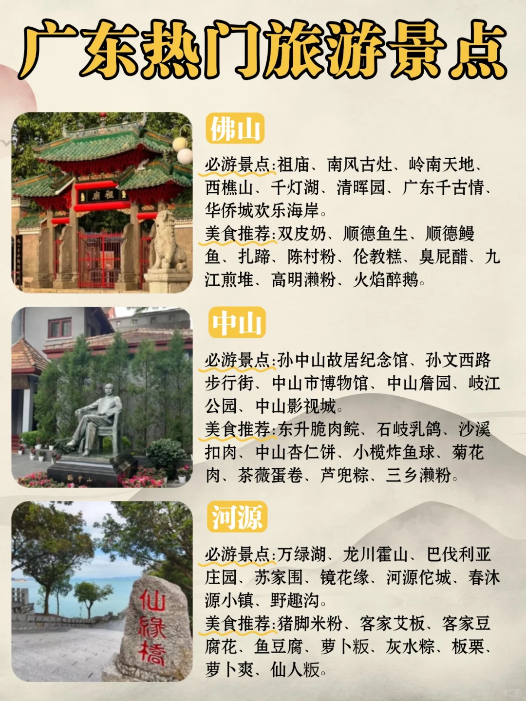 熬夜整理出来的汕头必打卡热门旅游景点\n清新浪漫的海景,还有独具特色的潮汕文化,吃货们绝对不可错过!👏\n-\n追寻潮汕风情与海岛奇遇🌴\n-\n📅Day 1️⃣:汕头站➡️小公园➡️汕头旅社➡️开埠文化陈列馆或邮政总局➡️广场轮渡➡️礐石风景区➡️潮汕历史文化博览Z心➡️西堤公园➡️龙眼路美食街\n·\n🚗交通:\n✈️飞机:揭阳潮汕国际机场,后乘机场大巴汕头东线、汕头西线抵达汕头市区\n🚄高铁/动车:汕头站,广州南过去3h左右,换乘公交(2/12路)或打车到金平区小公园。\n.\n🌟市区好吃好逛的大部分在老城区——金平区(大部分是潮汕土著),🏖看海去浪漫美丽的南澳岛\n.\n📈3天2晚精华游路线:\n1⃣️汕头站→小公园→汕头旅社→西堤公园→广场轮渡→礐石风景区→东海岸公园\n2⃣️汕头大桥→长尾山灯塔(南澳岛)→青澳湾→钱澳湾灯塔→北回归线广场→三囱崖灯塔→走马埔村\n3⃣️蛴仔澎风车场→环岛路(金银岛)→黄花山森林公园→芹澎岛和顶澎岛→回程\n.\n🍱美食推荐:\n🍲特色小吃:生腌、粿条、牛肉火锅、砂锅粥、卤鹅、海鲜烧烤、早茶、肠粉、无米粿、果汁冰、英歌魂、蚝烙\n.\n✅汕头市区:\n🥩牛肉店:石榴牛肉馆、杏花吴记牛肉、阿猴牛肉火锅、八合里海记、陈记顺和\n🦞生腌:瑞娇生腌、富苑饮食、长平肥姐、金二顺潮汕生腌、桂园白粥\n🍧奶茶/果汁冰:壹杯潮茶、上井奶茶、十二中红豆草莓沙冰、中山路亚强果汁冰\n.\n🍨其他打卡:\n🍖阿象肠粉、小吴肠粉、振兴丸店、老胡牛肉粿、傻脑蚝烙、老姿娘夜粥、盛记鹅肉、龙眼豆花、阿群甘草水果、老四家手锤牛肉丸、五洲牛肉美食馆、老胡牛肉粿、镇平粿汁、跃进鲎粿、糖葱薄饼、广场牌豆花甜汤、春梅里鹅肉店、围炉夜话、阿群甘草梅汁水果、老妈宫粽球、金凤酒楼\n.\n✅南澳岛:\n📍青澳湾\n🍱我家小厨、许大姐的菜、海石花\n📍后宅镇\n🍱锋味十足、青年海鲜小炒坊、好客来牛肉火锅、南澳打卡果汁公司、炳忠粿条面\n.\n🏨住宿推荐:\n✅汕头市区:\n选择住在万象城、小公园附近,性价比都不错,高档酒店、舒适型和经济型酒店都有\n.\n✅南澳岛:\n看日出推荐住青澳湾附近,看日落和吃美食推荐住在后宅镇附近。尽量选择一线海景房,性价比高,提前预定🌅\n@薯队长 @走走薯 @生活薯 @城市情报官\n#汕头旅游 #汕头攻略 #汕头美食 #南澳岛旅游 #汕头南澳岛 #潮汕旅游 #汕头旅游 #汕头旅游攻略 #周末去哪儿 #汕头旅游新发现