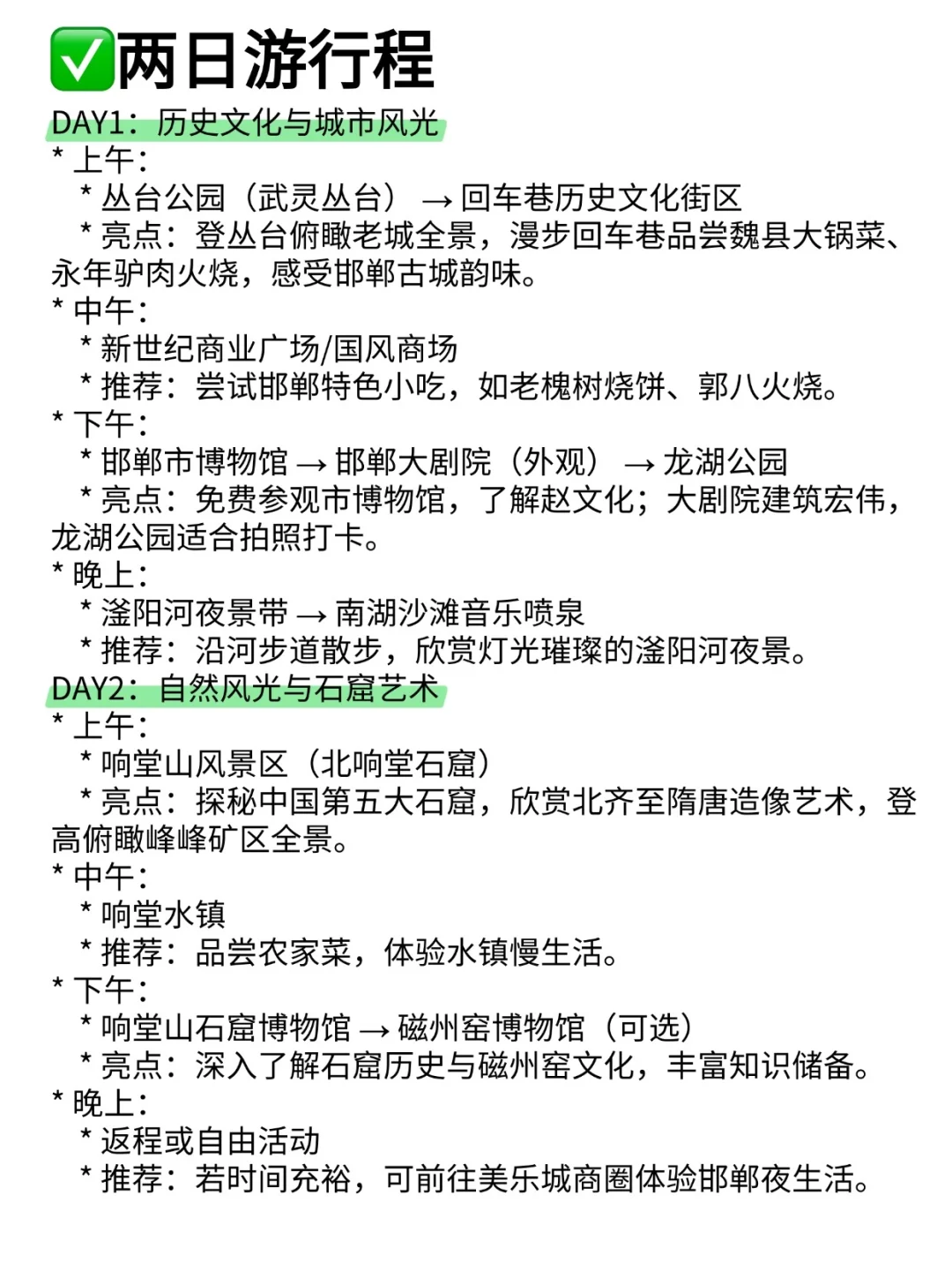 ✨宝子们,这次去邯郸旅游,真的收获满满🎉!现在来给大家分享一下我的旅游心得🧐。\n \n🎯响堂山:当我站在响堂山石窟前,(双手合十,闭上眼睛感受着)那精美的佛像和悠久的历史气息扑面而来,仿佛时间都在这里静止了😃,内心真的无比震撼🙏。\n \n🏞️丛台公园:踏入丛台公园,(漫步在石子路上,欣赏着周围的景色)亭台楼阁错落有致,小桥流水潺潺🌊,随手一拍都是大片📷,让我沉醉在这古典的美景之中🤩。\n \n🛕大乘玉佛寺:走进大乘玉佛寺,(感受到一种宁静祥和的氛围)寺内建筑宏伟,佛像庄严肃穆🙏,在这里我静静地坐了一会儿,感觉心灵都得到了净化🧘♀️。\n \n📚邯郸博物馆:邯郸博物馆就像一本生动的历史书📖,(仔细端详着每一件文物)丰富的展品带我穿越时空,了解到邯郸深厚的文化底蕴✨,真的是大开眼界👏。\n \n📍123师司令部旧址:来到123师司令部旧址,(怀着崇敬的心情参观)仿佛看到了当年革命先辈们在这里奋斗的场景,心中充满了对他们的敬意👍,这里的每一处都承载着那段波澜壮阔的历史。\n \n🎨磁州窑公路雕塑:磁州窑公路雕塑太有特色啦😜!(被那些独特的雕塑吸引住)它们展现了磁州窑的艺术魅力,为邯郸的道路增添了一道亮丽的风景线🤗,真的是创意满满。\n \n邯郸之旅,让我感受到了这座城市的独特魅力🎉🎉🎉!宝子们一定要来亲自体验一下呀😘#邯郸旅游 #旅游心得 #邯郸景点 #周末去哪儿#响堂山石窟 #旅游攻略 #小众旅行 #石窟艺术#响堂山 #河北旅游 #小众宝藏地#五一旅游 #毓秀响堂 #旅游路线