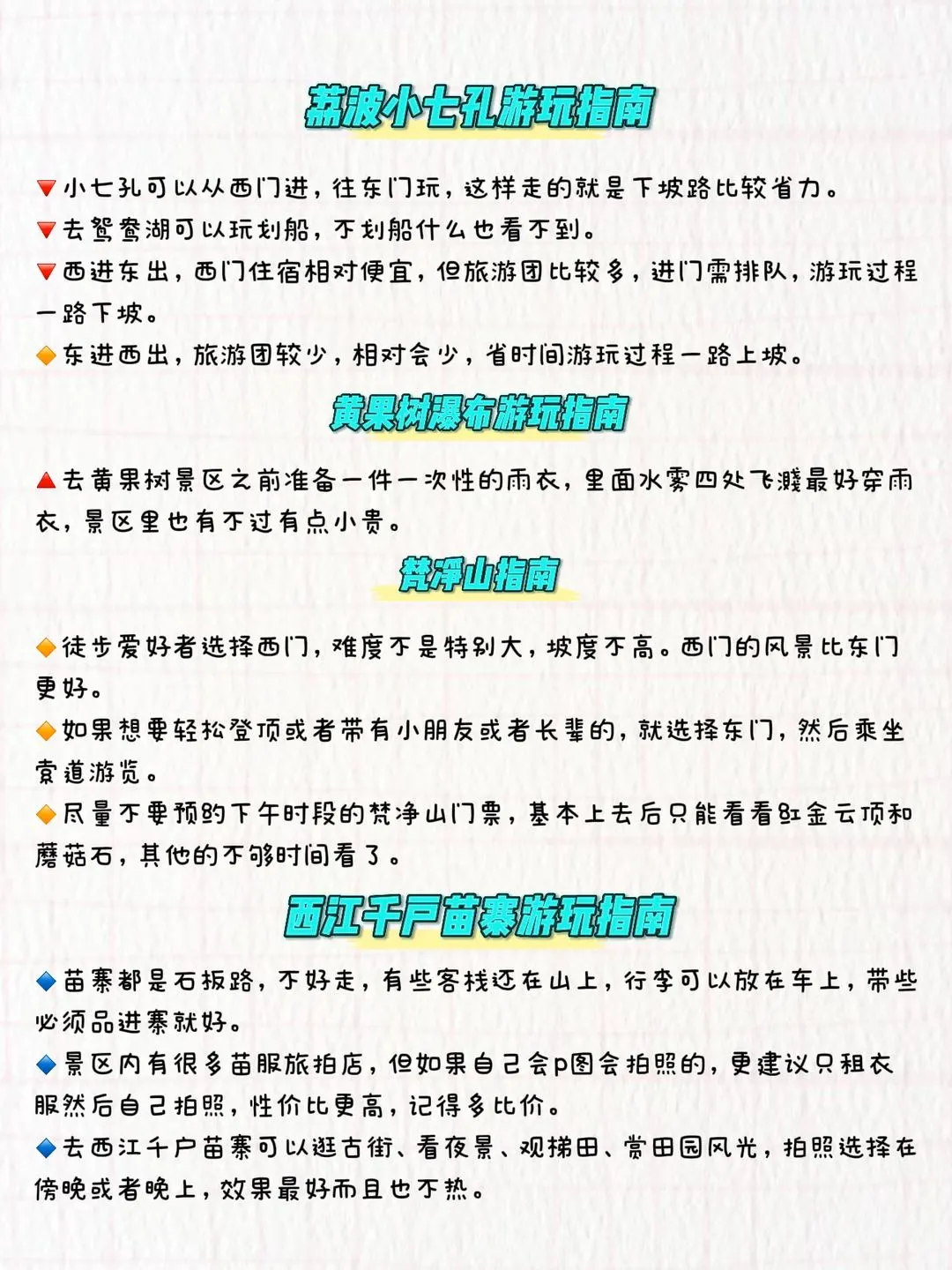 🔥趁着淡季,把西北旅游攻略重新整理了一遍!✅不饶路行程、美食推荐、景点预约、交通住宿,🈵满都是细节,5-7月打算去西北的朋友们,出发前一定要码住~\n-\n🔥精华景点 🏞\n📌青海湖 🌊:中国蕞大的内陆咸水湖,湖水清澈湛蓝,是观赏自然风光和候niao迁徙的绝 佳之地。📷\n📌茶卡盐湖 🌈:被誉为“天空之镜”,湖面如镜般反射天空的景色,漫步其中仿佛置身于幻境之中。\n📌张掖七彩丹霞 🌄:色彩斑斓,层理交错,仿佛大自然的调色盘被打翻在大地上,场面壮观,是甘肃的经典景点之一。\n📌嘉峪关 🏰:作为明长城zui西端的关口,嘉峪关历史上被称为“河西咽喉”,是古代“丝绸之路”的交通要塞。\n📌敦煌莫高窟 🕍:世界文化遗产,保存着大量精美的壁画和雕塑,是了解古代佛教艺术的重要窗口。\n-\n \n⚠️【出行避坑建议】\n1️⃣西北气候干燥,紫外线很强,注意补水保湿,做好防晒!\n2️⃣青甘饮食口味偏重,以咸辣为主地方饮食以面食为主。炒菜多以川味为主\n3️⃣常规路线高反微弱一般也就是2500-3000米左右所以不用担心没啥问题的\n4️⃣一般都会选择西宁作为起点从全国抵达西宁的航班和火车班次比较多,非常便利的\n5️⃣很多景点需要徒步走,记得穿舒适的运动鞋\n6️⃣刚来西北不要洗澡,不要剧烈运动🏃♂,容易高反\n7️⃣早晚温差较大,记得备好夏天衣物👗和冲锋衣、厚外套\n8️⃣可以买点零食路上吃,因为地广人稀,吃饭时间会不固定\n \n🏠住宿推荐\n⛩️西宁 :市中心酒店,方便游览\n⛩️敦煌 :靠近莫高窟的住宿,节省时间\n⛩️青海湖 :家庭旅馆或露营,享受湖边美景\n-\n美食推荐 🍽\n青海 🌶:凉面🍜、手抓羊肉🍖、青海酸奶🥛\n甘肃 🥟:驴肉黄面🥡、羊肉泡馍🍲,在小吃街一试\n#总要来一趟大西北吧 #大西北并非寸草不生 #青海旅游攻略 #青甘大环线 #西北大环线 #周末去哪儿