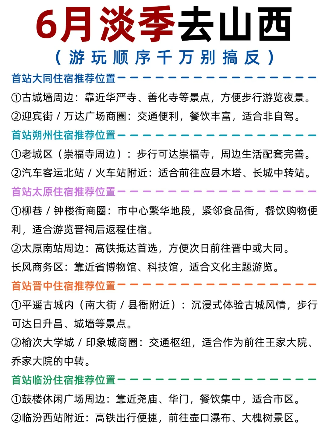 以下是大同古城旅游攻略,涵盖景点、交通、美食、住宿及实用贴士,助你深度体验这座千年古都的魅力:\n一、必游景点与路线推荐\n1. 核心古迹游\n路线推荐:鼓楼→华严寺→四牌楼→代王府→九龙壁→法华寺→大同雕塑博物馆→北城墙。\n- 华严寺:辽代建筑群,拥有全国最大的佛殿“大雄宝殿”,以及“东方维纳斯”合掌露齿菩萨。\n- 九龙壁:明代琉璃照壁,中国四大龙壁之一,龙身四爪彰显等级制度,光影下栩栩如生。\n-代王府:明代藩王府邸,建筑恢弘,结合历史与园林艺术。\n- 纯阳宫:闹市中的道教秘境,金元时期建筑,“回”字布局暗含道教哲学,免门票。\n2. 文化街区与新兴玩法\n- 东南邑历史文化街区:古建与现代设计融合,有艺术展馆、文创市集、咖啡馆等,适合文艺青年打卡。\n- 古城墙夜游:登南城墙赏灯会(冬季限定),以《黑神话:悟空》取景地为主题的花灯组和实景演出极具视觉冲击。\n \n3. 周边联动游\n- 云冈石窟(距市区16公里):世界文化遗产,推荐结合数字化体验(如VR、3D打印复制窟)感受千年石窟艺术。\n- 悬空寺(约1.5小时车程):悬崖上的北魏古寺,结构奇险,建议与恒山串联游览。\n二、交通指南\n- 市内交通\n- 公交:票价1-2元,覆盖古城主要景点(如3路、12路、35路等),运营时间6:00-22:00。\n- 打车:起步价7元,建议使用网约车避免被火车站司机高价揽客。\n- 自驾:古城周边停车场收费10-15元/次,节假日可能免费。\n景区直通车上车点在和阳门广场,大家如有规划,提前导航即可。\n三、住宿推荐\n- 经济型:中央公园或永泰学府附近的民宿,价格亲民且交通便利。\n- 中高端:古城内的云冈国际酒店或鼓楼周边精品客栈,兼具古韵与现代设施。\n四、特色美食与餐厅\n- 必尝小吃:刀削面(推荐“东方削面”)、浑源凉粉、百花烧麦、黄米凉糕、老大同什锦火锅。\n- 热门餐厅:\n- 凤临阁:百年老字号,以百花烧麦和传统晋菜闻名。\n- 龙聚祥:本地人推荐的刀削面馆,价格实惠。\n实用贴士\n1. 门票与预约:华严寺、善化寺等部分景点需预约,纯阳宫等免费开放。\n2. 避坑提醒:火车站附近慎选出租车,景区内餐饮价格正常(如刀削面7-10元/碗)。\n大同古城融合了北魏至明清的历史遗存与现代文旅创新,无论是古建爱好者、美食达人还是摄影玩家,都能在此找到独特的旅行体验。建议提前关注景区公告,结合季节活动规划行程!\n#景区直通车
