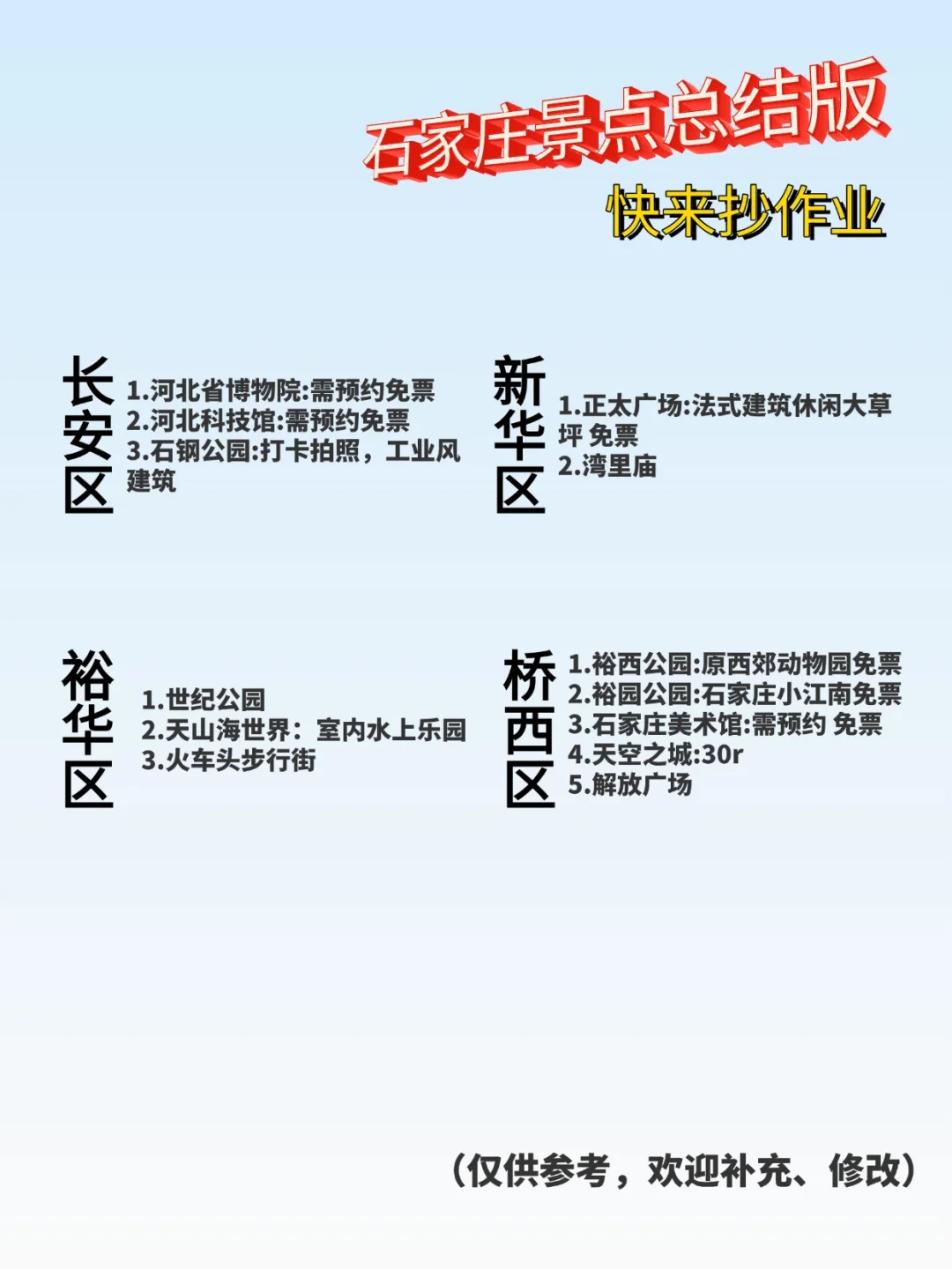 🌟【河北必打卡!五大绝美景点,不去后悔一辈子!】🌟\n姐妹们!今天给大家安利一波河北的绝美景点🏞,每一个都美到窒息,拍照打卡绝对刷爆朋友圈!📸\n1⃣ 承德避暑山庄\n皇家园林的顶配!🏯 夏天避暑首选,湖光山色美得像画一样,随手一拍就是大片!📷 记得穿汉服来,氛围感拉满!👘\n2⃣ 北戴河\n海边度假的天堂!🌊 沙滩、阳光、海浪,还有超美的日出日落,浪漫到不行!🌅 带上闺蜜or男友,来一场说走就走的海边之旅吧!👫\n3⃣ 白洋淀\n北方的小江南!🚤 乘船穿梭在芦苇荡中,感受水乡的宁静与诗意,还能吃到超新鲜的河鲜!🦐 秋天来,芦苇金黄,美得像童话!🍂\n4⃣ 野三坡\n大自然的鬼斧神工!⛰ 峡谷、瀑布、溶洞,每一处都让人惊叹!💥 喜欢户外探险的宝子们千万别错过,徒步、漂流都超刺激!🚣♀\n5⃣ 正定隆兴寺\n千年古刹,文化底蕴超深厚!🕍 寺内的佛像和壁画都是国宝级,震撼到说不出话!🙏 来这儿感受历史的厚重,心灵都被净化了!✨\n💡小贴士:\n每个景点都建议提前预约,避免排队哦!\n穿搭建议:舒适+拍照好看,鞋子一定要舒服!\n带上充电宝,拍照拍到停不下来!📱\n赶紧收藏起来,下次旅行就去河北打卡吧!📍 记得点赞+关注,更多旅行干货等你来挖!💖#风景名胜区 #拍照 #河北旅游 #保定 #秦皇岛 #承德