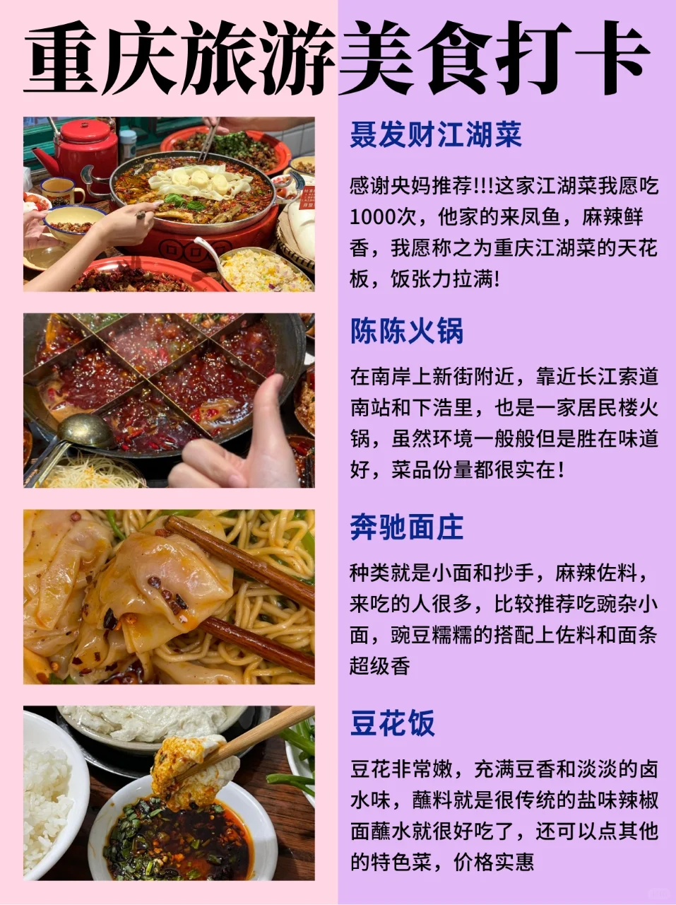 家人们,谁懂啊…😭被自己做的恩施攻略满意得睡不着!近期准备来恩施旅游的姐妹👭,花点时间做做攻略吧‼️希望大家不走冤枉路,我给大家整理了一份旅游攻略,可以用来借鉴哦~\n-\n游玩路线建议\n✅DAY1:恩施站→恩施土司城→女儿城→美食街\n✅DAY2:大清江景区→景阳大桥→蝴蝶崖→宜恩夜景\n✅DAY3:地心谷→悬崖玻璃酒店→地之心→民族大秀(西兰卡普)\n✅Day4:恩施大峡谷→绝壁云海→云龙地缝→七星寨→一柱香\n✅Day5:梭布坪→青龙台→九龙汇→莲花寨\n-\n恩施美食推荐\n✔️油香:不是平常的那种油炸饼,是外糠包裹土豆丝韭菜猪肉,大多外酥里嫩,里面的土豆被煮软了,口感真的很棒\n✔️合渣: 又称懒豆腐,是用黄豆和青菜做的,边煮边搅拌,吃起来有点像嫩豆腐,浸泡在汤汁里,拌饭吃巨香\n✔️洋芋饭:土豆切成小块,同洋葱和腊肉丁一起煎至金黄,底部的锅巴脆脆香香\n✔️土家酱香饼:号称\"中 国披萨\",制作材料有面粉、甜面酱、郫县豆瓣酱等\n✔️土家腊肉:恩施特有的美食,腊肉味道比较威,肉的颜色很好看,腊肉肠是zui好吃的\n✔️主家油茶汤:恩施一种独特点心,口感鲜美香脆,可以用于提神解渴,恩施人都非常喜欢的一种风味美食\n#恩施#恩施旅游#旅游攻略#恩施旅游攻略#本地人做的攻略#假期去哪玩#小众旅行地#旅行推荐官#恩施美食#恩施美食推荐#跟着本地人不踩雷#本地人推荐