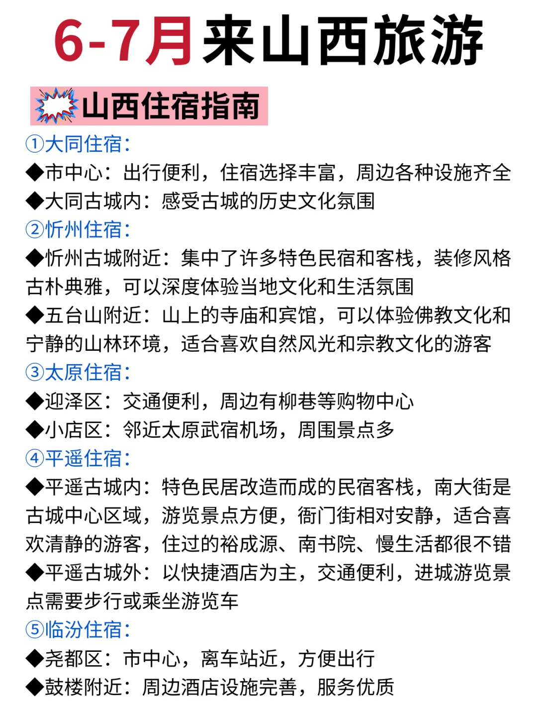 2025年暑假西安旅游攻略👏🏻全新。2025年暑假西安旅游攻略👏🏻全新。暑假准备打卡西安的宝子们,这份攻略一定不少❗\n详细说了各方各面㊙㊙\n从头发丝到脚趾盖给你安排的明明白白⚠⚠\n·\n✈出行准备\n证件:身份证、学生证、驾驶证💳\n电器:手机、充电器、充电宝📱\n生活用品:化妆品、日用、毛巾🧼\n防晒:防晒霜、 墨镜、防晒衣🕶\n衣物:早晚温差大记得带外套🧥\n药品:肠胃药、晕车药、创可贴💊\n少量现金:有时候现金就很方便💰\n其他:根据个人需求准备📽\n·\n➡关于住宿⬅\n1. 🌟钟鼓楼附近✨\n2. 🌟永宁门附近✨\n3. 🌟大唐不夜城附近✨\n4. 🌟地铁2号线附近✨\n·\n🚌西安交通出行\n1⃣地铁:没有堵车的风险,更节约时间🚊\n2⃣公交:有堵车风险,没通地铁的景区可乘坐\n3⃣出租车:起步价白天9元,夜间10元🚖\n4⃣旅游专线:适合较远、有专线的景点🚎\n5⃣租车:堵车,特别是假期,不建议🚘\n6⃣乘车码:👉地铁:西安电子地铁卡💳\n👉公交:长安通电子卡 ✨\n·\n📸西安景点打卡,及行程安排(五天)🏃🏻♂\n第❶天:抵达西安~入住酒店~自由活动🏃🏻♂\n第❷天:兵马俑~华清宫骊山~大唐不夜城✳\n第❸天:华山一日游🏔\n第❹天:黄帝陵~轩辕庙~壶口瀑布🌊\n第❺天:明城墙~大雁塔北广场~钟鼓楼广场~回民街~返程回家🏡\n·\n⚠⚠tips:西安是一个历史文化底蕴丰富的城市,不熟悉景点和交通,建议跟个靠谱的当地团,类似这个路线,仅需人均1⃣0⃣0⃣0⃣➕💰玩的都是西安的精华景点,交通和住宿都不用自己操心,放心跟着玩就是啦,可以省很多时间和精力来逛景点,算下来比自由行更省钱!\n·\n🍱西安美食推荐🍱\n▫陕拾叁✳\n▫茶话弄✳\n▫赵记素斋绿豆饼✳\n▫胖子甑糕✳\n▫玫瑰镜糕✳\n▫志亮蒸饺✳\n▫花奶奶酸梅汤✳\n▫长安大牌档✳\n▫魏家凉皮✳\n▫子午路张记肉夹馍✳\n#西安旅游攻略#西安旅游 #西安