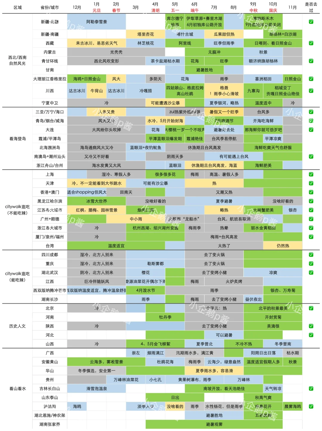 新疆5-6月份旅游攻略已完善✌️一张图看懂\n计划5-6月来新疆旅游的姐妹,超全攻略拿走不谢~\n这是我去了8次整理出来的攻略✅涵盖了旅游路线-交通-住宿-美食,记得先收藏,用的时候随时拿出来(看到Z后哦~)\n🧩必打卡景点🧩\n赛里木湖📍被誉为“大西洋最后一滴眼泪”,湖水湛蓝如镜,四周雪山环绕,春夏之际湖畔野花盛开,宛如仙境。\n那拉提📍那拉提草原被誉为“空中草原”,春夏时节绿草如茵,牛羊成群,冬季则被白雪覆盖,静谧而壮丽。\n六星街📍六星街是伊宁市的历史文化街区,街道呈六角星状分布,充满异域风情,适合漫步和拍照,还能品尝到地道的新疆美食。\n喀什古城📍穿越千年的西域风情,迷宫般的街巷、彩色门窗、手工艺坊,像走进《一千零一夜》!\n禾木村📍神的自留地,晨雾中的小木屋、金黄的白桦林,秋天美到窒息!\n✅新疆伊犁游玩路线(游玩顺序可调整)\n🎉️Day 1:落地乌鲁木齐-自由活动\n🎉️ Day 2:乌鲁木齐-赛湖日落-日落轰趴-赛湖营地\n🎉️ Day 3:赛湖营地-自驾环游赛里木湖-董衣草花田(花期安排)-多巴胺六星街-伊宁\n🎉️ Day 4:伊宁市-那拉提空中缆车-那拉提空中草原-私人牧场轻摄影旅拍-草甸营帐\n🎉️ Day 5:草甸营帐-独库公路-乌鲁木齐\n🎉️ Day 6:送机-温暖的家\n✅新疆北疆游玩路线(游玩顺序可调整)🎉\nD1 出发地--乌鲁木齐(接机)\nD2 乌市-S21沙漠高速-途径乌伦古湖-五彩滩-布尔津\nD3 布尔津-喀纳斯-卧龙湾-月亮湾-神仙湾-禾木小木屋\nD4 禾木-禾木村 -世界魔鬼城-乌尔禾沙漠主题酒店\nD5 乌尔禾-赛里木湖环湖-看日落-营地音乐会-赛湖营地\nD6 赛里木湖-赛湖日出-慢享赛里木湖-果子沟大桥-伊宁\nD7 伊宁-那拉提空中草原-专享VIP通道-那拉提镇民宿\nD8 那拉提-独库公路-唐布拉百里画廊-小华山段-乌鲁木齐\nD9 乌鲁木齐-温暖的家(送机)哦\n#新疆伊犁 #北疆大环线 #新疆小团 #新疆旅游攻略 #这辈子总要去趟新疆吧 #新疆之旅 #伊昭公路 #独库公路 #那拉提 #恰西草原