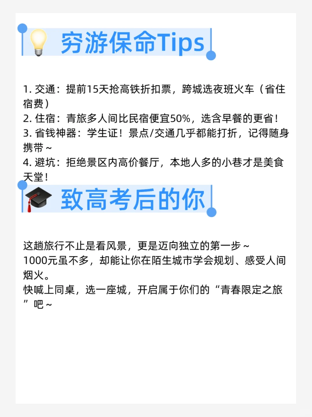👋宝子们,高考结束啦,是不是迫不及待地想开启一场说走就走的旅行呢🧳?但是在出发之前,有一些旅游注意事项一定要知道哦,下面就来给大家详细说说😎。\n💖**一、安全第一**\n🌟证件安全:身份证可是非常重要的,不管是乘坐交通工具🚄,还是入住酒店🏨,都离不开它。一定要妥善保管,最好准备一个小的证件包,把身份证、准考证(有些景点可能会有优惠哦)、学生证等证件都放在一起,方便拿取又不容易丢失🤗。\n🌟人身安全:在旅途中,要时刻保持警惕😏。如果是一个人旅行,尽量选择人多、光线好的地方活动。如果是跟团游,要听从导游的安排。避免去一些偏僻或者治安不好的地方🙅♂。另外,在游玩一些刺激性项目,一定要遵循安全指示,穿戴好防护装备💪。\n🌟财物安全:现金不用带太多,现在很多地方都可以手机支付啦📱。但是手机一定要保护好,它不仅是支付工具,也是联系家人朋友的重要方式。背包最好背在身前,特别是在人多拥挤的地方,防止小偷🤫。\n💖**二、行程规划**\n🌟目的地选择:可以根据自己的喜好来选择目的地。喜欢历史文化的同学可以去西安、南京等古都;喜欢自然风光的可以去桂林、张家界等地;想要体验海边风情的,三亚、青岛都是不错的选择🌊。不过在选择的时候,也要考虑当地的天气、旅游旺季等因素哦😉。\n🌟交通预订:如果是热门旅游地,一定要提前预订好车票或者机票✈。这样不仅可以节省费用,还能确保有座位。同时,了解一下当地的交通情况,比如有没有地铁、公交是否方便,是否需要租车🚗等。\n🌟住宿安排:住宿的地方要选择在交通便利、安全的区域。可以通过正规的旅游APP查看酒店或者民宿的评价,选择性价比高的住宿🤩。如果是女生单独旅行,尽量选择安全性高的酒店,比如连锁酒店等。\n💖**三、健康问题**\n🌟必备药品:出门在外,难免会有一些小状况。带上一些常用药品,如果去的地方蚊虫比较多,还要带上防蚊液哦🧴。\n🌟饮食卫生:品尝当地美食是旅行中的一大乐趣,但是要注意饮食卫生😋。尽量选择正规的餐厅,避免吃一些路边摊的生冷食物,防止拉肚子🤢。\n💖**四、文化礼仪**\n🌟尊重当地文化:不同的地方有不同的风俗习惯。#高考生 #\n#旅游注意事项 #高考后的假期 #旅行攻略 #高考不是结束而是新的开始\n宝子们,希望这些注意事项能让你们的高考后旅行更加完美💗,祝大家都能度过一个愉快难忘的假期🎉!