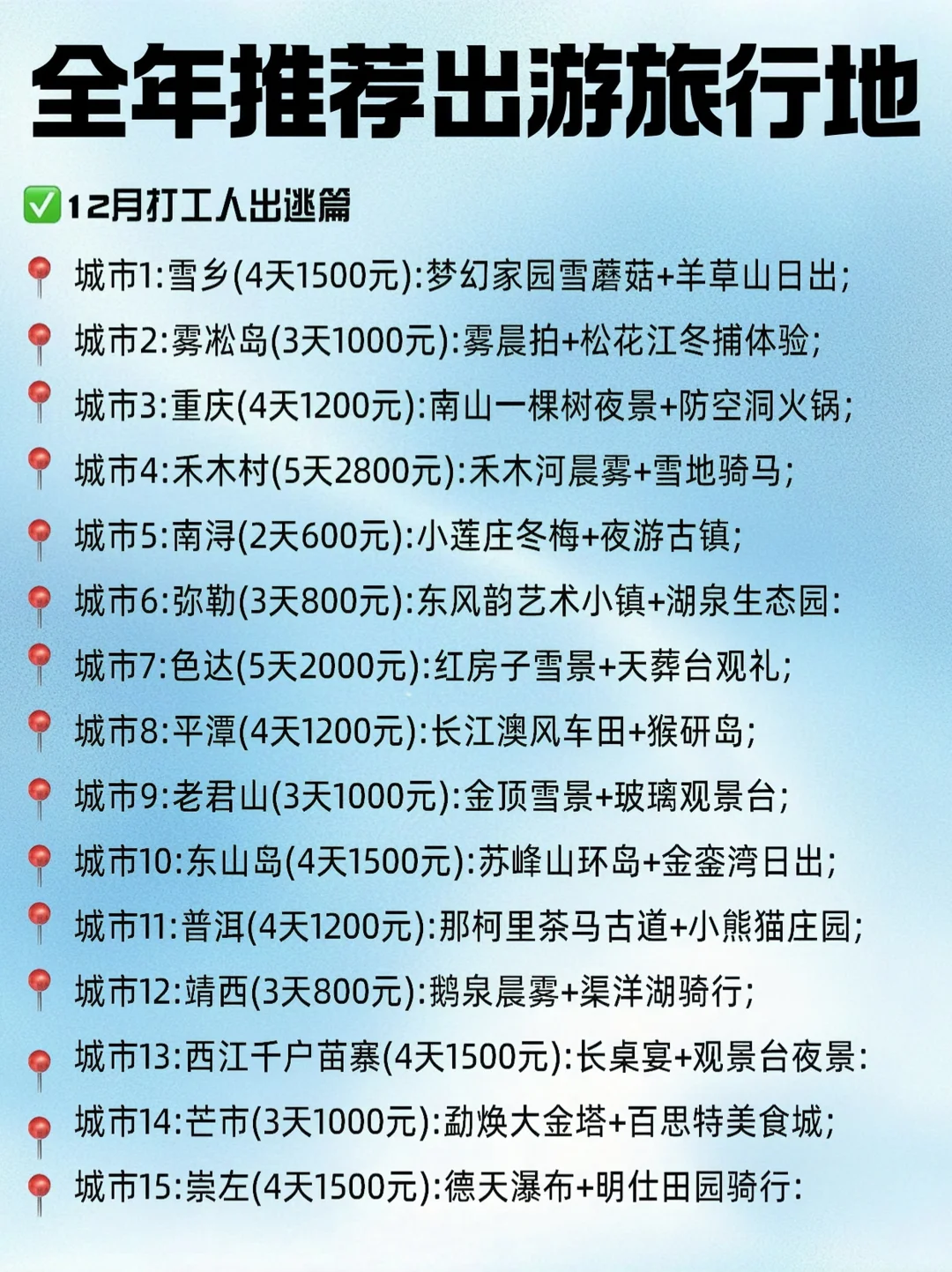 最新版国内旅游景点攻略‼️\n🌍 终于有人把中国旅游景点讲明白了!🙌 2025旅行计划!中国省市旅游推荐!\n🚄 新的一年,新的旅行目标! 你准备好开启一场说走就走的旅行了吗?🏕️🎒 这份全国旅游推荐,涵盖了中国的山川湖海、古镇名城、自然奇观,总有一个地方让你心动!快收藏!📌\n🇨🇳 | 2025,一起出发,探索中国的大好河山❗ | 🇨🇳\n📍 北京——历史与现代交融的古都🏯\n🔥 必打卡:故宫、长城、天安门广场\n🚶♂️ 漫步紫禁城,站上长城眺望万里风光,感受中华五千年历史的厚重!\n📍 福建——海滨与山水的浪漫碰撞🏝️\n🔥 必打卡:厦门鼓浪屿、武夷山\n⛵ 漫步鼓浪屿小巷,听海风呢喃;登上武夷山,感受丹霞地貌的奇妙!\n📍 广东——繁华都市与岭南文化的交融🏙️\n🔥 必打卡:广州塔、深圳世界之窗\n✨ 俯瞰珠江夜景,感受都市璀璨,打卡世界各地的微缩景观!\n📍 贵州——隐秘仙境,山水画卷⛰️\n🔥 必打卡:黄果树瀑布、荔波小七孔\n💦 世界级瀑布震撼眼前,水上森林宛如仙境,绝对是洗肺之旅!\n📍 海南——热带天堂,碧海蓝天🏖️\n🔥 必打卡:三亚亚龙湾、天涯海角\n🏝 住进海边度假酒店,躺在细软沙滩上,看海听风,度过惬意假期!\n📍 黑龙江——冰雪世界的童话王国🎿\n🔥 必打卡:哈尔滨冰雪大世界、雪乡\n❄️ 在雪乡体验最梦幻的冬季童话,玩转冰雪大世界,点亮冬日奇迹!\n📍 湖北——江城风情,山水如画🏞️\n🔥 必打卡:武汉东湖、黄鹤楼\n🚢 乘船游东湖,登上黄鹤楼,看长江天际一线,感受诗意江城!\n📍 湖南——奇峰怪石,湘西秘境🌉\n🔥 必打卡:张家界、凤凰古城\n🏞 天门山云海壮丽,凤凰古城夜色撩人,这里藏着最原汁原味的湘西风情!\n📍 吉林——极致冰雪,北国秘境❄️\n🔥 必打卡:长白山天池、雾凇岛\n🎿 雾凇美景如梦如幻,长白山天池神秘莫测,冬天来这里才算完整!\n📍 江苏——诗意江南,古镇水乡🌿\n🔥 必打卡:苏州园林、周庄古镇\n🚤 在周庄坐乌篷船游水巷,在苏州园林里品味诗意江南!\n📍 江西——道教名山,仙境秘境🌲\n🔥 必打卡:庐山、三清山\n🌄 云海缭绕,宛如仙境,感受大自然的鬼斧神工!\n📍 #大众旅游地 大,2025去哪玩? 🗺️ 快来评论区选出你的下一站!💬#值得玩的地方 #旅游推荐 #必去的地方