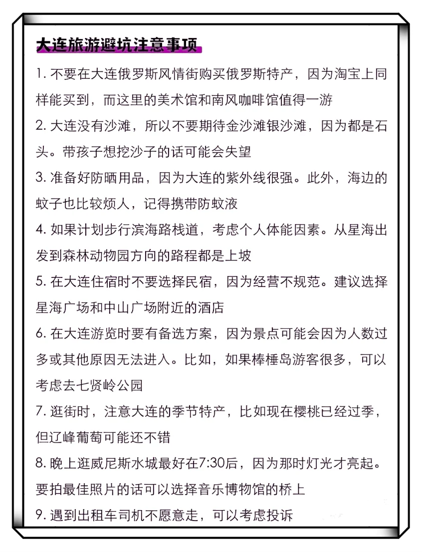 有海的城市总是多了一份浪漫与惬意,那就来威海吧。6-8月计划去威海,这篇不废腿版保mu级攻略需要提前码住~ 只有旅游对才能玩的对,快收藏吧\n.\n关于交通🚄\n🚄高铁:威海北站靠近国际海水浴场!威海站靠近韩乐坊\n✈️飞机大水泊国际机场,大巴一条线20r\n🛵电动车/自驾:威海景点相对分散,适🈴环海专用小电驴或者自驾\n🚌公交:票价1-1.5r环海观光巴士🈶四条线路,一定提前一天订好票\n.\n📝游玩路线\nDay1:火炬八街➡️国际海水浴场➡️金海湾栈桥➡️猫头山➡️半月湾➡️海源公园➡️幸福门➡️刘公岛➡️欧乐坊\nDay2:那香海➡️布鲁威斯号➡️摩天岭索道\n.\n行前准备\n✅证件类:身份证、学生证、自驾游的要带上驾驶证\n✅电器类:充电宝、充电器、手机、耳机、喜欢拍照的🉑以带上相机\n✅衣物类:威海靠近海边,早晚温差较大,且天气多变,多带几件长袖外套\n✅其他物品:太阳伞、墨镜、口罩、遮阳帽、自拍杆\n.\n图文已经全部被授权@小卜会变瘦 别误判\n.\n#旅游万粉扶持计划 #跟着兴趣去旅行 #先出发再说#我是快乐行动派 #威海 #威海旅游 #威海旅游攻略 #威海美食 #旅游攻略 #旅游拍照 #假期去哪玩 #江浙沪周边游 #周末去哪儿 #假期去哪儿 #威海旅行#威海打卡 #大学生暑假旅游 #城市的一百种玩法 #穷游攻略 #解锁本地人逛吃玩法 #值得为吃而去的小城 #不为打卡的旅行 #特种兵式旅游