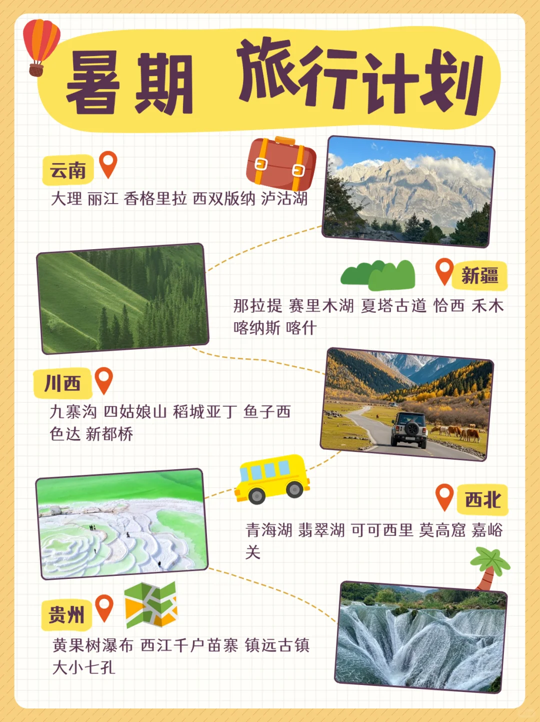 青春不散场!毕业季当然要用一场超酷的旅行纪念~整理了9⃣️个神仙旅行地,从海边到山城,从古都到文艺小城,快和兄弟闺蜜冲就对了!💨\n📍山东-#威海\n📝景点:成头山、刘公岛、中日甲午战争博物馆、威海国际滨海浴场、威海公园、鸡鸣岛、火炬八街、银滩旅游度假区、那香海、猫头山、海源公园\n✅美食:鲅鱼水饺、葱烧海参、清蒸牡、老醋蛰头、盐水大虾、渔家四宝、菜粑粑\n📍河南-#洛阳\n📝景点:龙门石窟、应天门、天堂明堂、洛阳博物馆、白马寺、洛邑古城\n✅美食:牛肉汤、羊肉汤、豆腐汤、焦炸丸子、牡丹燕菜、连汤肉片、蜜汁红薯、肉合、浆面条、胡辣汤、烩面、麻辣面\n📍湖北-#恩施\n📝景点:恩施关峡谷、屏山大峡谷、地心谷、腾龙洞、仙山贡水\n✅美食:油香,豆皮,烤活鱼,烧饼,土家油茶汤,烤鱼,炕土豆,洋芋饭,合渣,张关合渣\n📍云南-#大理\n📝景点:崇圣寺三塔、 洱海、苍山、大理古城,喜洲古镇\n✅美食:喜洲粑粑、烤乳扇、烧饵块、凉虾、鲜花饼\n📍江苏-#南京\n📝景点:玄武湖,南京博物馆,鸡鸣寺,夫子庙,老门东,中山陵,音乐台,总统府,红山动物园,梧桐大道\n✅美食:梅花糕、乌饭麻糍、鸭血粉丝汤、皮肚面、桂花汤圆、牛肉锅贴、蟹黄汤包、盐水鸭\n📍川西-#甘孜\n📝景点:稻城亚下、九寨沟黄龙四姑娘山、海螺沟欢桥沟、备子西\n✅美食:牦牛肉汤锅、牛肉盖被、牛肉炒饭、牛肉灌汤包、冰片牛肉、火烧子馍馍、青稞饼、奶渣饼、酥油茶\n📍四川-#成都\n📝景点:九眼桥, 大熊猫基地, 宽窄巷子,杜甫草堂,武侯祠,都江堰\n✅美食:冒烤鸭、钵钵鸡、麻辣兔头、老妈蹄花、跷脚牛肉、甜水面\n📍湖南-#长沙\n📝景点:橘子洲头、 杜 甫江阁、岳麓山、湖南博物馆, 古开福寺\n✅美食:茶颜悦色、臭豆腐、米粉、口味虾、糖油粑粑、紫苏桃\n📍青海-#西宁\n📝景点:塔尔寺、青海湖、 丹噶尔古城、东关清真大寺 茶卡盐湖、南关清真寺、\n✅美食:酸奶,手抓羊肉,酿皮,羊肉串,炕锅羊肉,炕锅羊排,牛奶鸡蛋醪糟,甜酪,牦牛酸奶,麻辣烫#出发永远比向往更有意义
