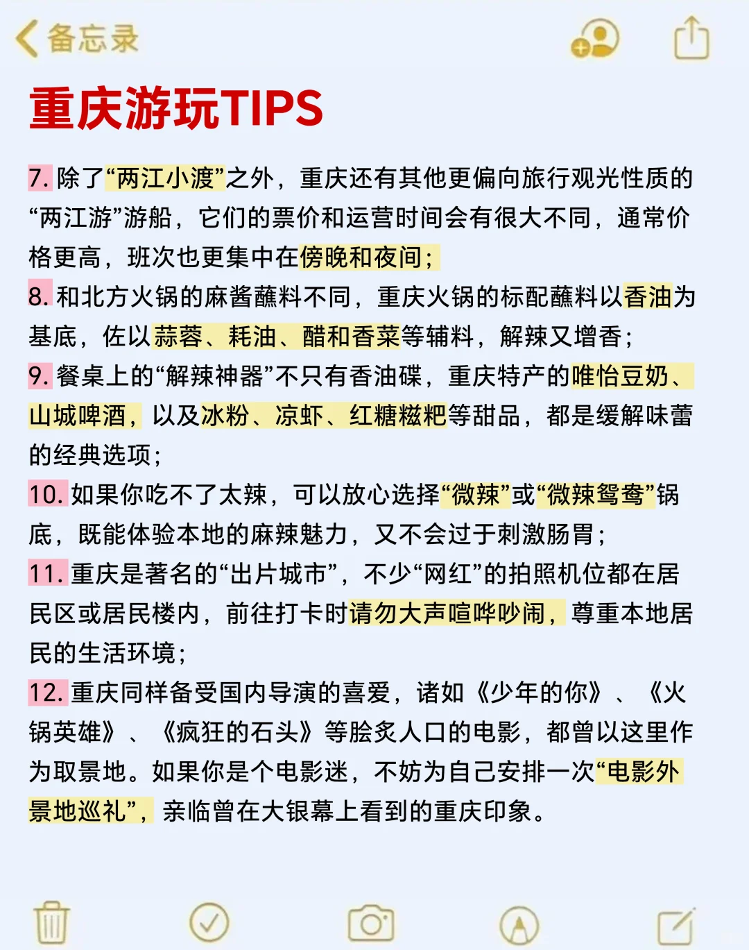 宝子们根据我的游玩经验总结了威海值得去、不值得去的景点&美食,希望能帮到想去威海的姐妹们,可以收藏慢慢看哦~\n❤️ 行李准备\n💧 身份证:是重中之重!很多景区都需要身份证才能进,如果有学生证也要带着,景区门票会便宜一点。\n💧 药品:创口贴、酒精棉片、棉签、一次性碘伏棉、红霉素软膏、过敏药、肠胃药\n💧 护肤:必要的护肤品和化妆品、防晒\n💧 其他:充电器、充电宝、墨镜、雨伞、洗漱用品、湿巾、纸巾\n⚡ 注意事项\n⚡ 有电动车和汽车可租,记得提前预约,电车要充满电、汽车要加好油!一定要检查车况!!!\n⚡ 荣成天鹅冬天可以来看啦!\n⚡ 吃饭不要再去网红店,可以到威海必吃的海鲜店,海鲜都很新鲜,特别是生蚝个头大,肉质肥美,再配上饮料绝绝子~\n大,肉质肥美,再配上饮料绝绝子~\n⚡ 晴天和阴天的威海真的是两个样子,想拍出好看的照片一定要在晴天来哦!\n⚡ 去任何岛上的景点都提前查一下开不开!\n🔥 美食\n🍜 喜欢吃韩餐的宝子们可以去东城路夜市,韩乐坊夜市,欧乐坊夜市看看,有很多韩国的特色美食!\n#威海 #威海旅行全攻略 #威海海滩游玩指南 #威海旅游 #旅行 #四方心动#威海美食 #周末去哪儿 #国内旅游日常 #人文景点分享 @生活薯 @日常薯 @旅游攻略