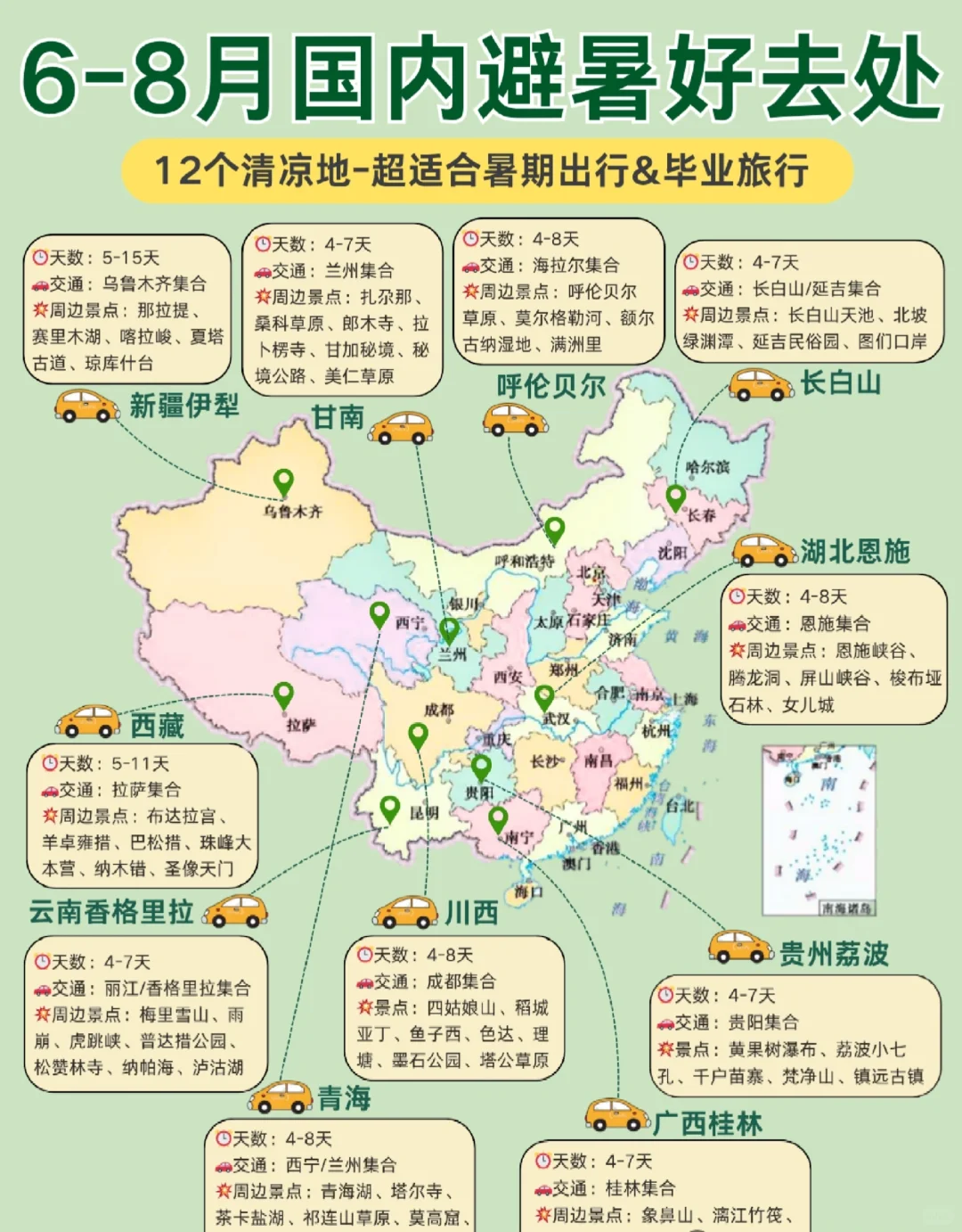 7-8月是气温最高的时候🥵,不知不觉中,今年暑假即将如约而至,炎炎夏日,哪些地方适合避暑呢?👉🏻\n这边整理了40个国内避暑天花板的地方,赶快码住❤️~远离城市👣,走进大自然🏞️去凉爽的地方看美丽的风景吧!\n川西\n7-8月平均气温在8-22°C,一年四季都可以观看到雪山,甚至有些景点可以看到日照金山的景象\n還时间:3-7天\n景点:四姑娘山、九寨沟、稻城亚丁、达古冰川、鱼子西、色达、新都桥等\n甘南必\n7~8月平均气温20°C左右,风景如画,值得打\n卡\n(时间:3-5天\n景点:郎木寺、拉卜楞寺、甘加秘境、扎尕那、桑科草原、尕海湖等\n新疆心\n7~8月平均气温10~25°C左右,广阔的草原、湖泊和森林,独库开放后可以看到一年四季不同的景色\n没时间:7-12天\n景点:喀纳斯、赛里木湖、那拉提、琼库什台、夏塔古道、禾木等西藏\n7~8月平均气温8~24°C左右,不同的人文景象,了解当地特色文化,体会不同风情\n数时间:5-10天\n么景点:布达拉宫、巴松措、萨迦寺、雅鲁藏布江、嘎东寺、拉姆拉错等\n松赞存\n7~8月平均气温10~22°C左右,,有很多的自然风光和历史遗迹\n时间:5-7天\n景点:松赞林寺、羊卓雍措、纳木错、香格里拉、丽江、拉姆拉错等\n贵州喺\n7-8月平均气温20-25°C,苗族侗族的聚居地,看形态各异的钟乳石,穿着当地服饰,感受不同风情\n爱时间:3-6天\n《景点:荔波大小七孔、黄果树瀑布、西江千户苗寨、镇远古镇、梵净山等呼伦贝尔总\n7-8月平均气温不超过20°C,特别适合亲子游和度假,骑马驰骋还你一个草原梦\n时间:5-7天\n景点:黑山头、呼伦贝尔大草原、鄂温克鹿园、额尔古纳、呼伦湖等\n青海\n7-8月平均气温20-25°C,来自大自然的馈赠,随便一拍,大片即显时间:5-7天\n《景点:茶卡盐湖、七彩丹霞、翡翠湖、青海湖、西宁、塔尔寺、嘉峡关等\n更多详细避暑圣地,请看上图#穷游攻略 #出行攻略 #无滤镜旅行攻略 #自驾游路线 #旅游攻略 #人文景点分享 #游玩攻略 #旅游推荐 #旅游 #旅行