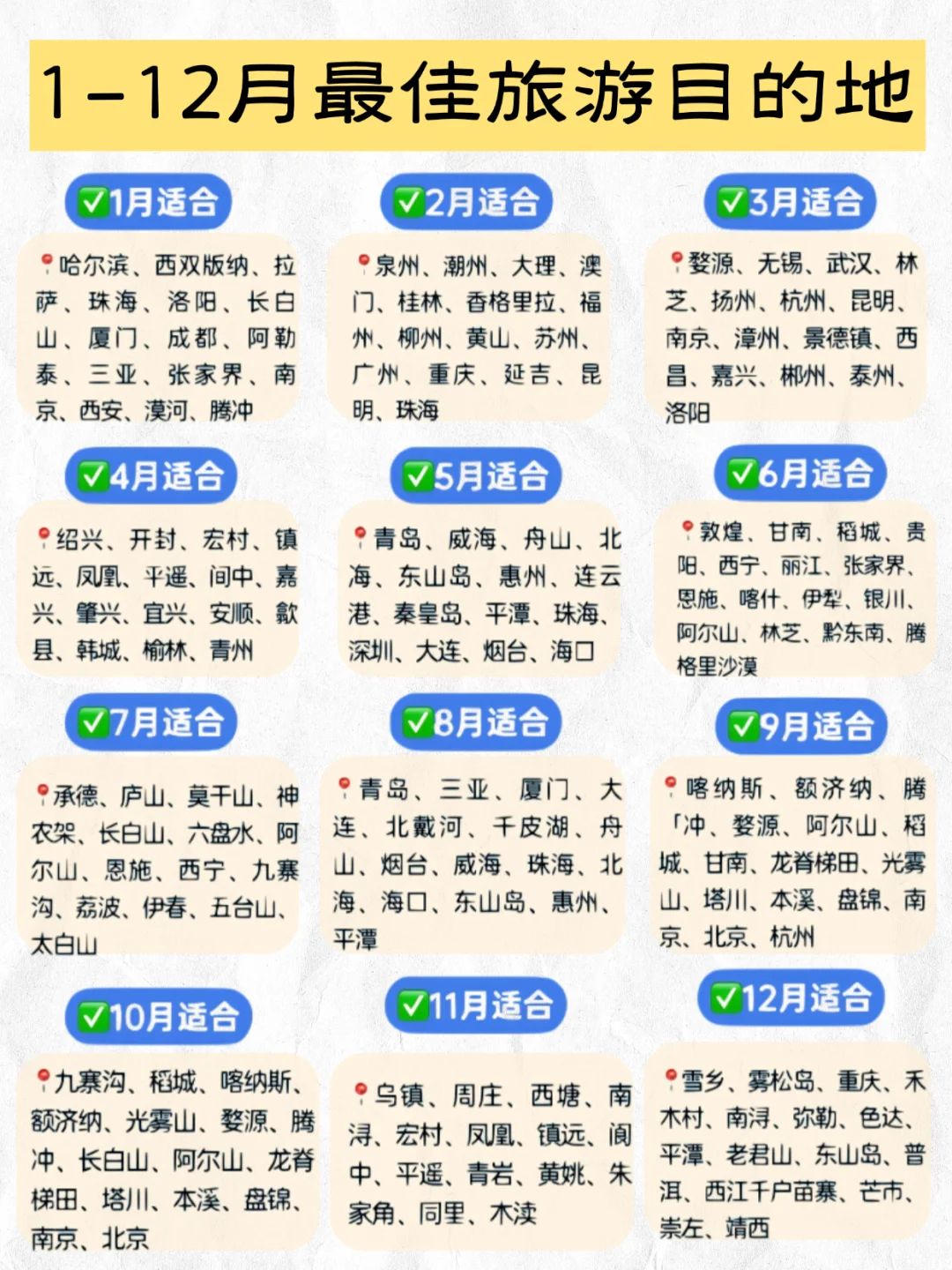 祖国山河无限好,穷尽一生游几何?毕业不到二十年去了全国大部分城市,推荐十个天花板级别的景点\n一、丽江古城:\n建筑多采用木结构,以四合院为主要形式,屋顶覆盖着青瓦,显得古朴典雅。\n这座承载着丰富历史与文化的古城,不仅以其独特的建筑风格、深厚的民族风情吸引着游客,更以其丰富多彩的美食体验让人流连忘返。\n二、西湖\n西湖的历史背景为其增添了浓厚的文化底蕴,使其不仅仅是一个自然景观,更是一个充满故事和传说的地方。\n“江南好,风景旧曾谙。日出江花红胜火,春来江水绿如蓝。能不忆江南?”这句诗恰恰道出了西湖山水景观的魅力所在。\n三、黄山\n黄山的树,有的松树弯曲成各种形状,如龙、如凤、如虎、如狮,栩栩如生,令人叹为观止。\n黄山的云海也最为壮观,每当雨过天晴,站在山顶,俯瞰四周,只见云海如波涛般汹涌澎湃,无边无际,仿佛置身于仙境之中。\n四、张家界\n自然奇观和人文风情相得益彰,为游客提供了一次难忘的旅游体验。\n唐代诗人杜甫曾在此留下了“峡里谁知有人事,世中遥望空云山”的千古绝唱。\n五、桂林山水\n位于中国广西壮族自治区的东北部,地理位置独特,被誉为“山水甲天下”。\n漓江作为桂林山水的核心景区,全长160公里,沿途风光旖旎,美不胜收。其中,阳朔段的漓江风光更是被誉为“百里画廊”,吸引了无数游客前来观赏。\n六、新疆伊犁\n这个多元文化交融的绿洲,四季景色美如画。每个季节都有各自的气候特色和自然景观,真的是大自然的杰作。\n春秋四季,伊犁有着无端变化的风景,雪山、森林、湖泊你想看到的风景都汇聚于此。\n七、九寨沟\n因其壮丽的自然风光和丰富的藏族文化而蜚声中外,被誉为“人间仙境”。\n不仅以其壮丽的自然风光吸引着无数游客,更因其深厚的藏族文化与历史而独具魅力。\n八、敦煌莫高窟\n位于中国甘肃省敦煌市,这里是古代丝绸之路的重要节点,也是多元文化交融的见证。\n作为世界文化遗产的瑰宝,不仅是中国古代艺术的巅峰之作,更是全人类文明的宝贵遗产。\n九、布达拉宫\n不仅仅是风景,更是它独特的文化与精神,打动了无数游行的旅客在此驻足。\n它远离尘嚣,也许没有多么绚丽的风景,但当你走上这片土地,你会真正感受到从内而外的宁静。\n十、乌镇\n是江南水乡的典型代表,如果你喜欢江南,那么乌镇一定可以满足你对江南的所有幻想。\n这里的建筑多以木结构为主,白墙黛瓦,古朴典雅。\n以上你去过几个呢#旅游