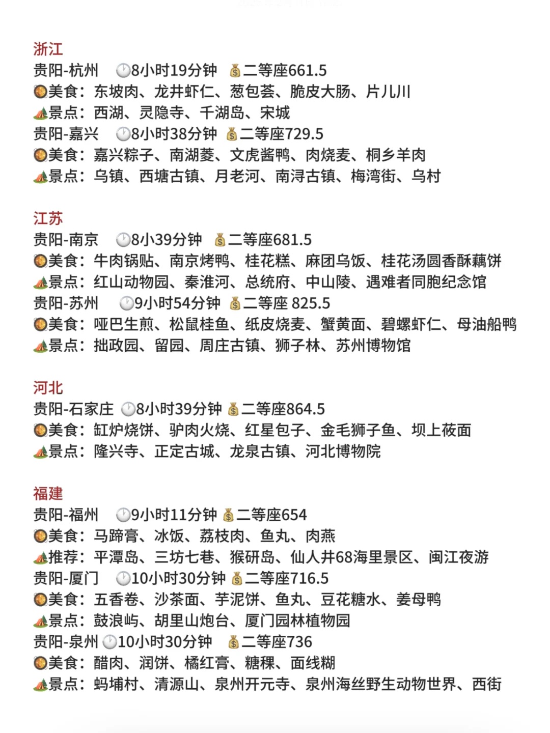 打工人特种兵集合‼️今年国庆中秋双节连放8天假期!\n📝小鹿贴心整理【广州出省游必去的16个宝藏目的地】\n🏯从世遗古城到喀斯特山水,从海岛秘境🏖️到烟火老街\n🚄高铁出发2-5h可达,轻松玩转3-5天,🎉玩法丰富,人少景美\n.\n \n✅【广西篇】\n1⃣桂林\n🚩景点:船游漓江、兴坪古镇、日月双塔、龙脊梯田、靖江王府、相公山、遇龙河竹筏\n🍱美食:桂林米粉、阳朔啤酒鱼、田螺酿、全州醋血鸭、芋头扣肉\n.\n2⃣️贺州\n🚩景点:黄姚古镇、姑婆山、玉石林景区、紫云仙境、东潭岭\n🍱美食:牛肠酸、豆豉、竹笋酿、粉角、蒸排骨、黄田扣肉、\n.\n \n3⃣️崇左\n🚩景点:德天跨国瀑布、明仕田园、通灵大峡谷、太平古镇、峒那屿湾\n🍱美食:土鸡火锅、五色糯米饭、香叶烤牛肉、桄榔粉、百香果排骨\n.\n4⃣️北海\n🚩景点:涠洲岛、北海老街、鳄鱼山公园、石螺口海滩、北海银滩、侨港风情街\n🍱美食:鸡肉粉、蟹仔粉、卷筒粉、炸春卷、鸡屎藤籺、虾仁饼、清蒸石斑鱼\n \n.\n✅【湖南篇】\n1⃣️长沙\n🚩景点:橘子洲、岳麓山、湖南省博物馆、黄兴步行街、太平老街\n🍱美食:臭豆腐、口味虾、糖油粑粑、辣子鸡、小龙虾、米粉\n.\n2⃣️郴州\n🚩景点:高椅岭、五指峰、仰天湖、东江湖、飞天山、王仙岭\n🍱美食:栖凤渡鱼粉、杀猪粉、东江鱼、烧鸡公、猪杂粉、云耳蒸、蕨根粑粑\n.\n✅【福建篇】\n \n1⃣️漳州\n🚩景点:东山岛、火山岛南靖土楼、云水谣、镇海角、漳州古城、\n🍱美食:蚵仔煎、手抓面、麻糍、咸粿、卤面、四果汤、绵绵冰、沙茶面、菜头粿、烧肉粽\n.\n \n2⃣️福州\n🚩景点:三坊七巷、林则徐纪念馆、福建省博物馆、平潭岛、烟台山\n🍱美食:福州鱼丸、肉燕、平潭海蛎煎、时来运转、八珍炒糕 、佛跳墙、琵琶虾\n.\n3⃣️泉州\n🚩景点:西街、开元寺、浔埔村、关岳庙、天后宫、清源山、洛伽寺、清净寺\n🍱美食:姜母鸭、面线糊、醋肉、麻糍、满煎糕、石花膏、土笋冻、海蛎煎\n \n.\n✅【江西篇】\n1⃣️上饶+婺源\n🚩景点:三清山、望仙谷、婺源篁岭、婺女洲、葛仙村度假区、李坑、龟峰、灵山\n🍱美食:荷包红鲤鱼、婺源汽糕、铅山清补凉、灯盏粿、油条包麻糍粿、粉蒸肉\n.\n2️⃣南 昌\n🏞景点:滕王阁、万寿宫、八一广场、秋水广场、海昏侯博物馆、江西省博物馆\n🍱美食:白糖糕、南昌水煮、瓦罐汤、南昌拌粉、蟹脚捞粉、藜蒿炒腊肉\n@福鹿游\n#假期去哪玩 #小众旅行地 #广州周末去哪儿 #广州周边游 #广州高铁跨省游 #国庆去哪儿玩 #广州高铁游