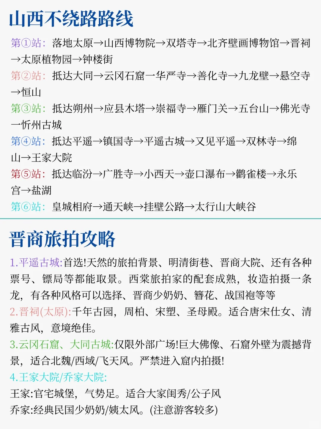🈯路线安排\nDay1:西陵峡路➡️栈桥➡️圣弥厄尔大教堂➡️信号山➡️宫崎骏漫画街➡️小鱼山➡️琴屿路➡️台东步行街➡️五四广场\nDay2:石老人浴场➡️雕塑园➡️海之恋公园➡️小麦岛➡️燕儿岛➡️情人坝\n \n🚖青岛交通\n✔️胶东国际机场:8号线换乘3号线,可直达栈桥/五四广场;还有机场大巴直达到市里\n✔️高铁/火车站:建议选青岛北站或青岛站,不要选青岛西站,离市区较远\n✔️地铁🚇出行很方便,覆盖大部分景点\n❌青岛没有共享单车,距离近的景点可以步行前往\n \n🏘住宿\n🉑五四广场附近🉑台东步行街\n \n景点介绍\n📍西陵峡路:通往大海的绝美公路,不同于栈桥的人山人海,这里相对人少景美\n📍栈桥:青岛地标景点,来这里打卡的人不计其数,每年11月份有海鸥,景色很美\n📍圣弥厄尔大教堂:庄严肃穆的宏伟建筑,宁静和庄重交融,充满历史和艺术气息\n📍信号山:山体海拔不高,几分钟即可登顶,可以看到青岛的红房和海景\n📍宫崎骏漫画街:每处墙都有彩绘,画笔描绘栩栩如生,幸福感满满,拍照打卡很出片\n📍小鱼山:以海为主题,漫步其中,仿佛置身于一副古风画卷,视野很开阔\n📍琴屿路:网红座椅、孤独的树,值得去拍照打卡,这里的海水真的很治愈\n📍石老人:这里的沙滩很细腻,光脚踩上去很舒服,退潮后还可以抓小螃蟹\n📍海之恋公园:坐在长椅上感受海风,那一刻仿佛时间静止了,很喜欢这里的氛围\n📍小麦岛:景色很美,打卡点很多,夕阳落山的画面美出天际,打卡“孤独的树”\n📍燕儿岛:通往大海的木栈道,海水和礁石相互碰撞,看着一望无际的大海,心情都会变得舒畅\n \n注意事项\n1️⃣去海边要做好防晒,尽管夏天过去了,室外光线依旧很晒\n2️⃣海边风景很美,拍照出片,但要记得看涨潮情况,避免被困礁石\n3️⃣老城区单行道多,停车位不多,也不好找,停车费也不便宜,不建议自驾\n4️⃣不要买景点外面的黄牛票,基本都是被坑,可以提前去正规平台买\n5️⃣青岛美食选择性多,可以多对比,不要相信出租车司机推荐的景点和餐厅,基本都是拖\n6️⃣住宿不建议海景房,有溢价成分,尽量选择交通比较方便的地方,选择多,性价比高\n7️⃣青岛的天气多变,建议随身携带雨具,注意避雨\n8️⃣去圣弥厄尔大教堂注意着装,不要带零食进去\n#青岛旅游 #青岛旅游攻略 #旅游攻略 #假期去哪玩 #不为打卡的旅行 #青岛美食 #国庆旅游#青岛旅行 #青岛 #青岛攻略