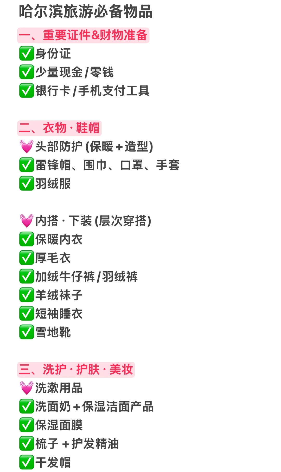 衣物:加厚羽绒服、防水靴、帽子手套、保暖内衣