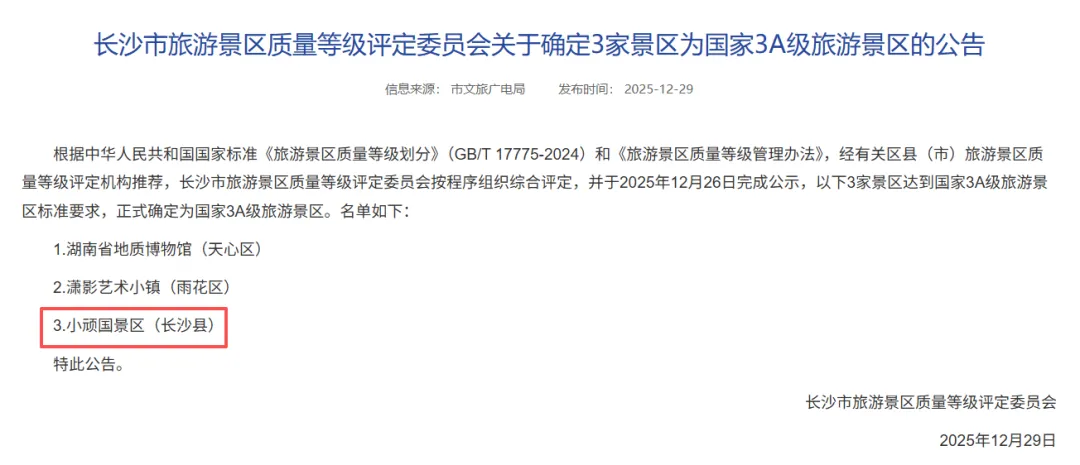 12月29日,长沙市旅游景区质量等级评定委员会发布公告,长沙县黄花镇银龙村的小顽国景区成功获评国家3A级旅游景区,也是全县在本轮评定中唯一入选的景区。