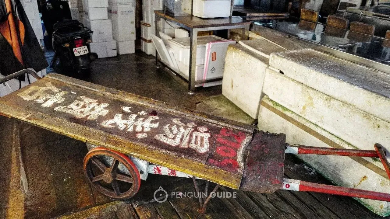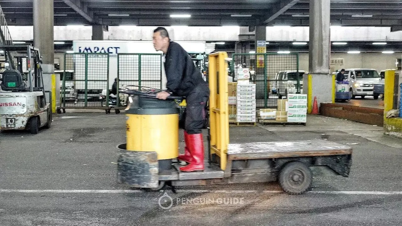 硕大繁忙的市场里,商家对兴奋过度的游客们早已司空见惯。穿梭着的Tare(车头装置有标志性气罐的平板车,多刷成醒目的黄色或蓝色)上,踩着高筒胶鞋头扎毛巾的奥吉桑(大叔)一面对游客大声吆喝“让路让路”,一面不减车速,在狭窄又湿滑的通道里飞驰而过,留下道路两边受了点惊吓的游客们略微难为情的脸,和拍糊掉的相片。