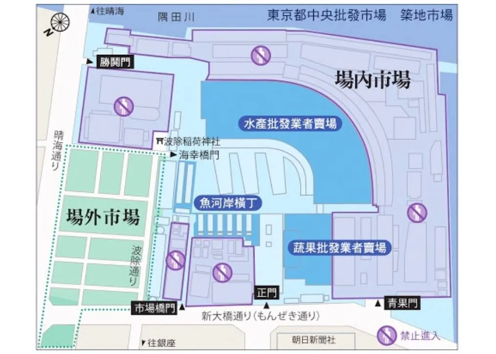 当地人所说的筑地市场,一般仅指批发市场及其附属建筑,即上图绿色以外的部分,被称为场内。场内共有7家大型的注册水产上盘商(上盘商,又称出货公司,是将水产从产地运到市场的第一手批发商),约1000家注册仲卸(也叫中盘商,可简单理解为从上盘商手中拿货的第二手批发商),其中水产中盘商约有650家,每日市场买卖的水产超过1800吨,活鱼约为45吨。场内的交易场所限制民众随意进出,但被称为鱼河岸横丁的饮食店和零售店建筑群对民众开放,在旅游攻略里常见的大和寿司、寿司大等“网红店”便位于此处。
