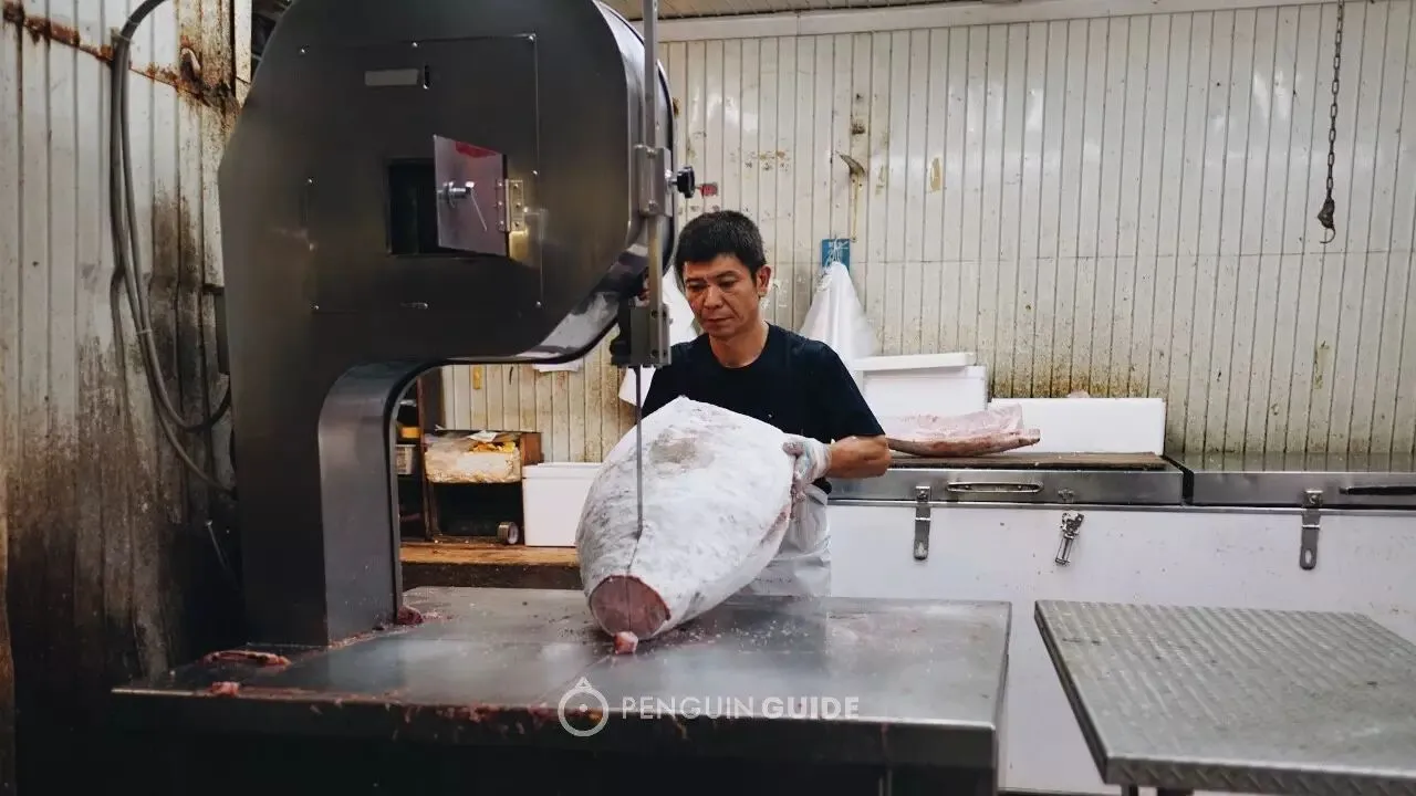 理论上,中盘商批发市场在早上10点前(原本是早9点)是不允许游客进入的,但如果你运气好,早进批发市场未受阻拦,或者哪家金枪鱼中盘商的动作慢,也可能看到整条金枪鱼的解体和切分作业。切分金枪鱼是非常专业的工作,金枪鱼最后的品质如何,一刀下去的功夫很深。