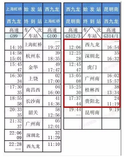 香港西九龙高铁列车时刻表(沿沪昆、贵广方向)
