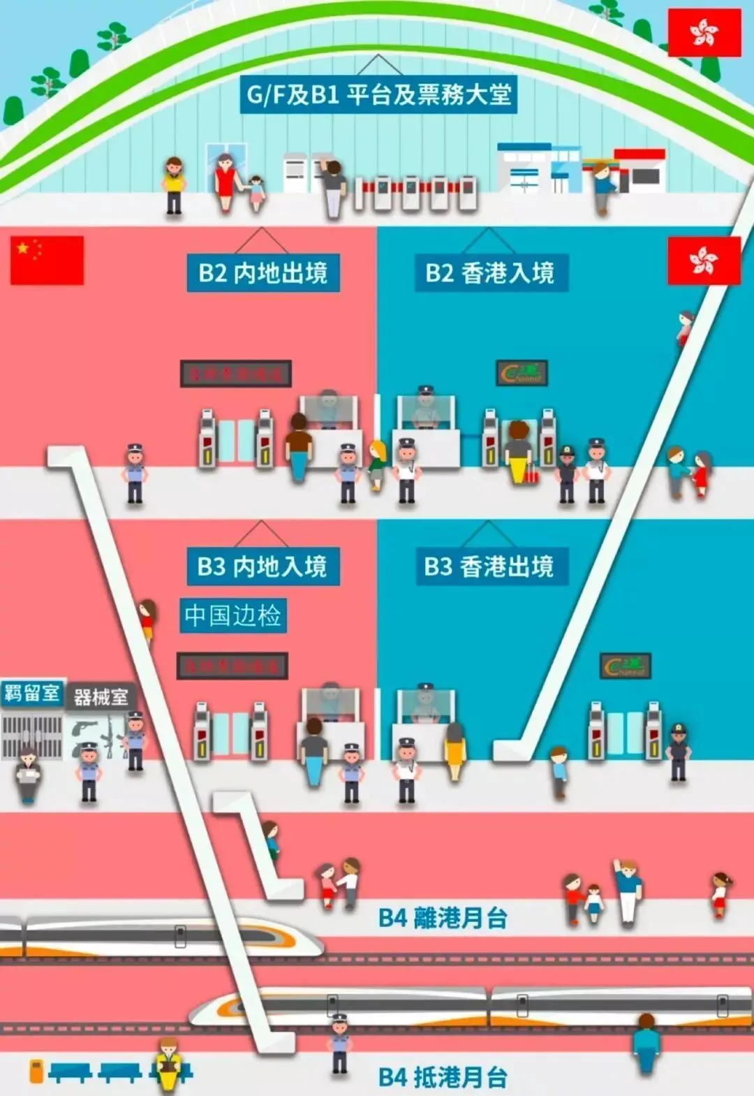”一地两检”:经由广深港高铁进入香港,只需在西九龙站即可完成两地的出境与入境手续。作为世界最大地铁站,香港西九龙站共设有5层,分别是: