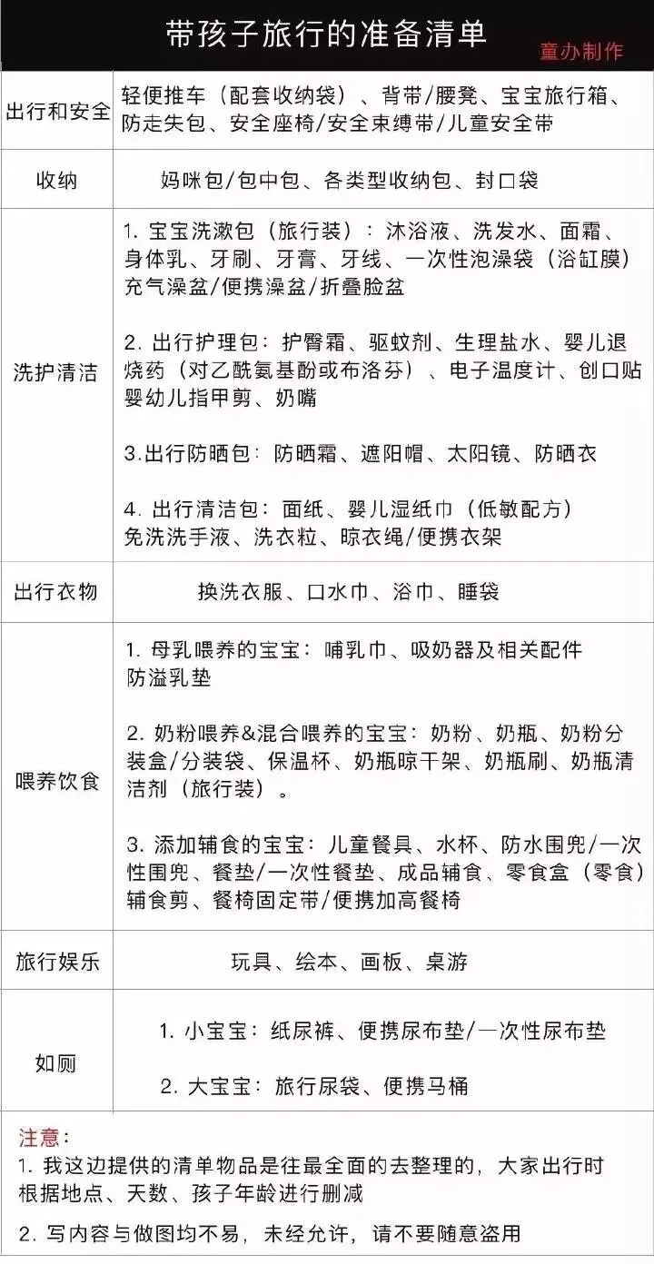 旅行的准备我是根据童办之前发表的《带孩子旅行的准备清单》作为参考,再根据我家宝宝的月龄进行添加和删减的,我觉得这张表格做的很好,也建议大家可以看一下。