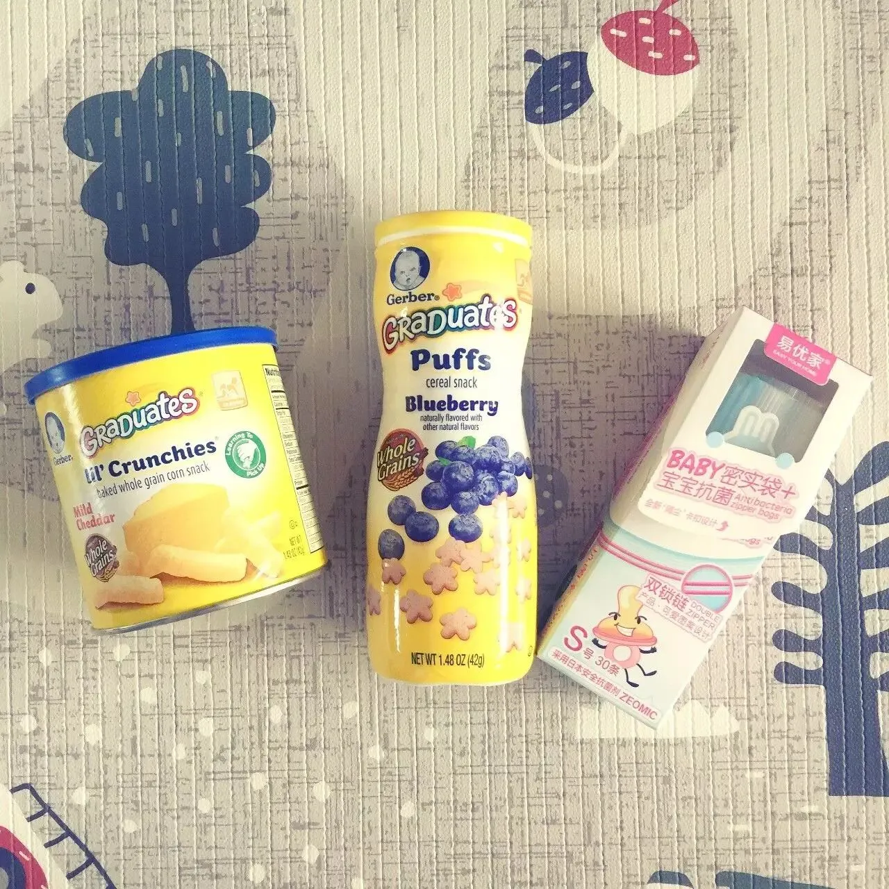5. 婴儿零食——嘉宝的星星泡芙和泡芙条,婴儿零食是非常必备的,因为在飞机起飞和降落的时候,有效的咀嚼可以降低气压变化带来的不适,由于在起飞和降落时婴儿是被绑着安全带的,所以喂奶会有些不便,婴儿零食还是比较推荐的。