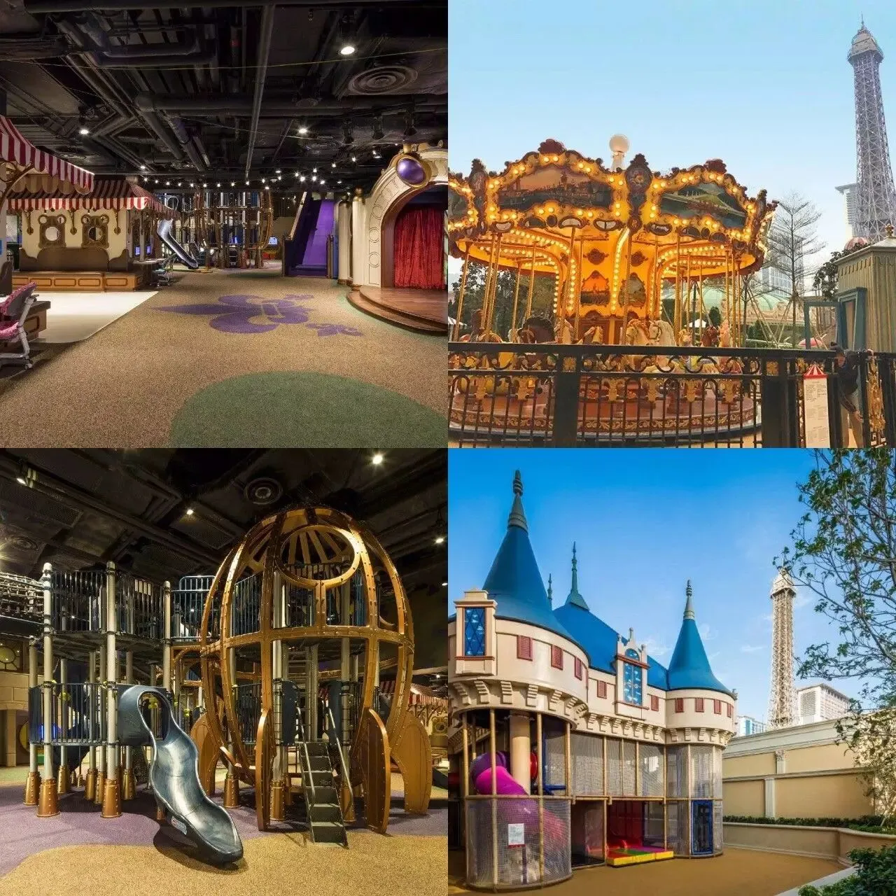 Q立方王国——儿童乐园位于巴黎人酒店的六楼,分室内和室外两个部分,由于宝宝还只会扶站和扶走,我们并没有带他去玩,但也参观了下这个儿童乐园,室外是一个小城堡和旋转木马,室内有攀登太空舱、气垫曲棍球、滑滑梯、海洋球等各种游乐项目。这个儿童乐园是需要收费的,价格在一百人民币左右。