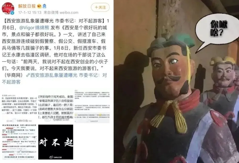 前几年在西安“假兵马俑”风波时期,许多游客去西安甚至要先在网上搜索一版避坑指南,这些指南包括从火车站到景区一路上如何避开和识别出各种骗子。