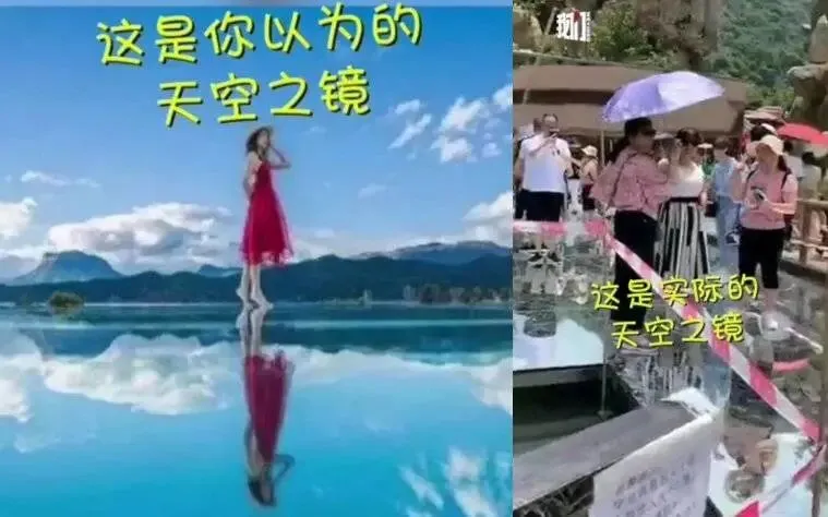 再比如这两年各地都在斥巨资打造的网红景点“天空之镜”。光看文案与照片,这可谓是不去就后悔的人间仙境:站在天空之镜上如同悬挂蓝天之上,走在上面犹如漫步云端,悬空而行……