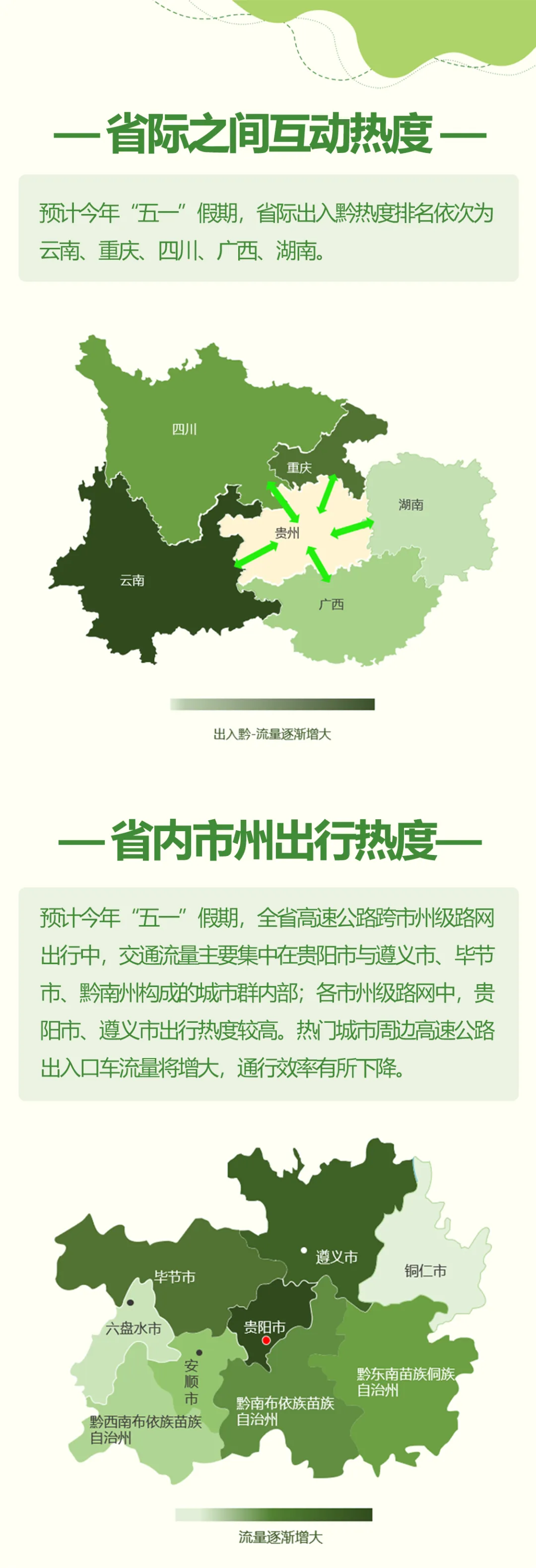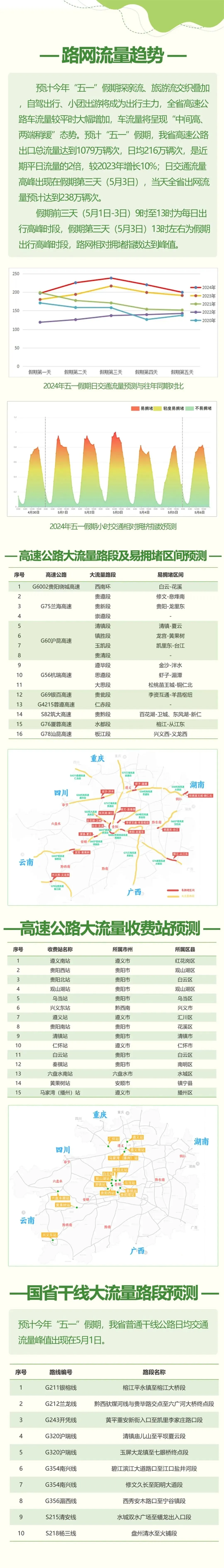 高速免费+景区免门票!贵州“五一”旅游攻略交通运输部公路局副局长郭胜提示,高速公路免费通行是以车辆驶离出口收费车道的时间为准。假期即将结束时,假如您的行车时间已经接近免费时段截止时间,也就是5月5日假期最后一天的24时,此时您还没有到达目的地,这个时候您可以选择在就近收费站先行驶出高速公路,这样您此前的行程免费。 附: