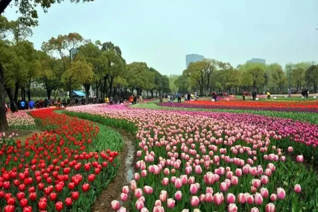 园内33万株郁金香汇聚成一片望不到头的花海,白,粉,浅紫三色为主色调。春季一年一度的“郁金香花博会”在这里展开。