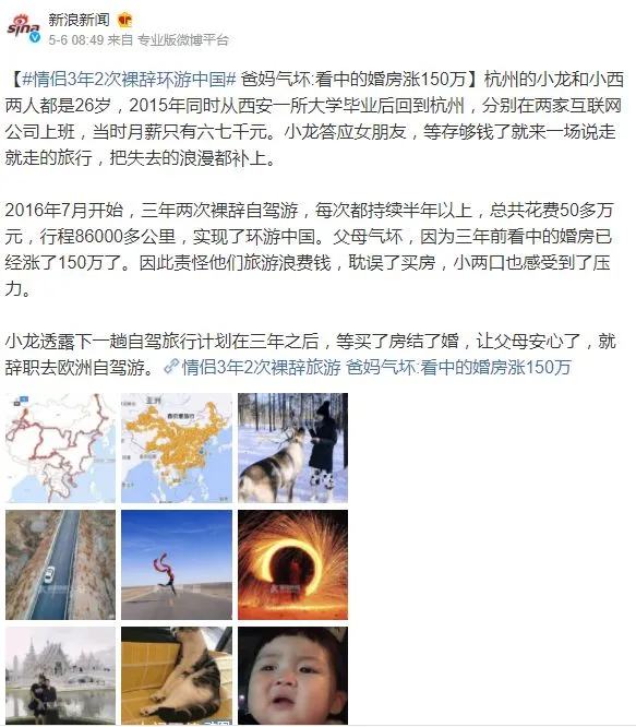 △Instagram上有一个叫“Public Lands Hate You”的匿名账号,专门公示部分Instagram网红在景区不负责任的行为 如果这样的话,我们又何必怪罪网红景点处处都是坑爹的障眼法呢。 这种错位多半是我们非要赋予什么样的诗与远方的想象,多半是我们想要用这些景点装点我们贫乏的朋友圈而已。 曾经有朋友问过我:如果手上一笔钱只能够成为房奴和旅行,你会选择哪一样? 这让我想到前不久有条热搜:一对杭州情侣游遍中国后,发现自己透支没法付房贷,于是只能靠父母掏钱。