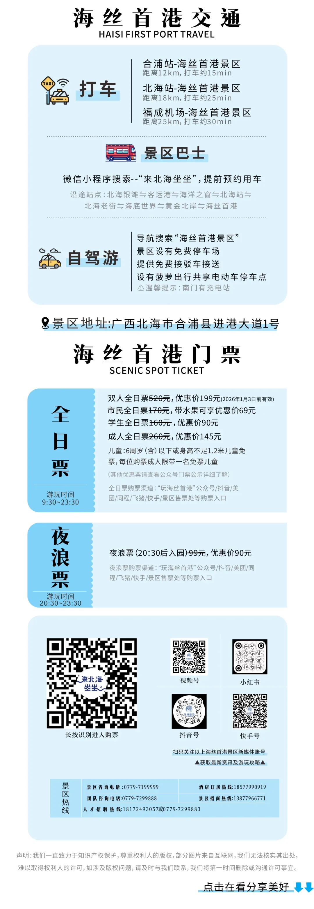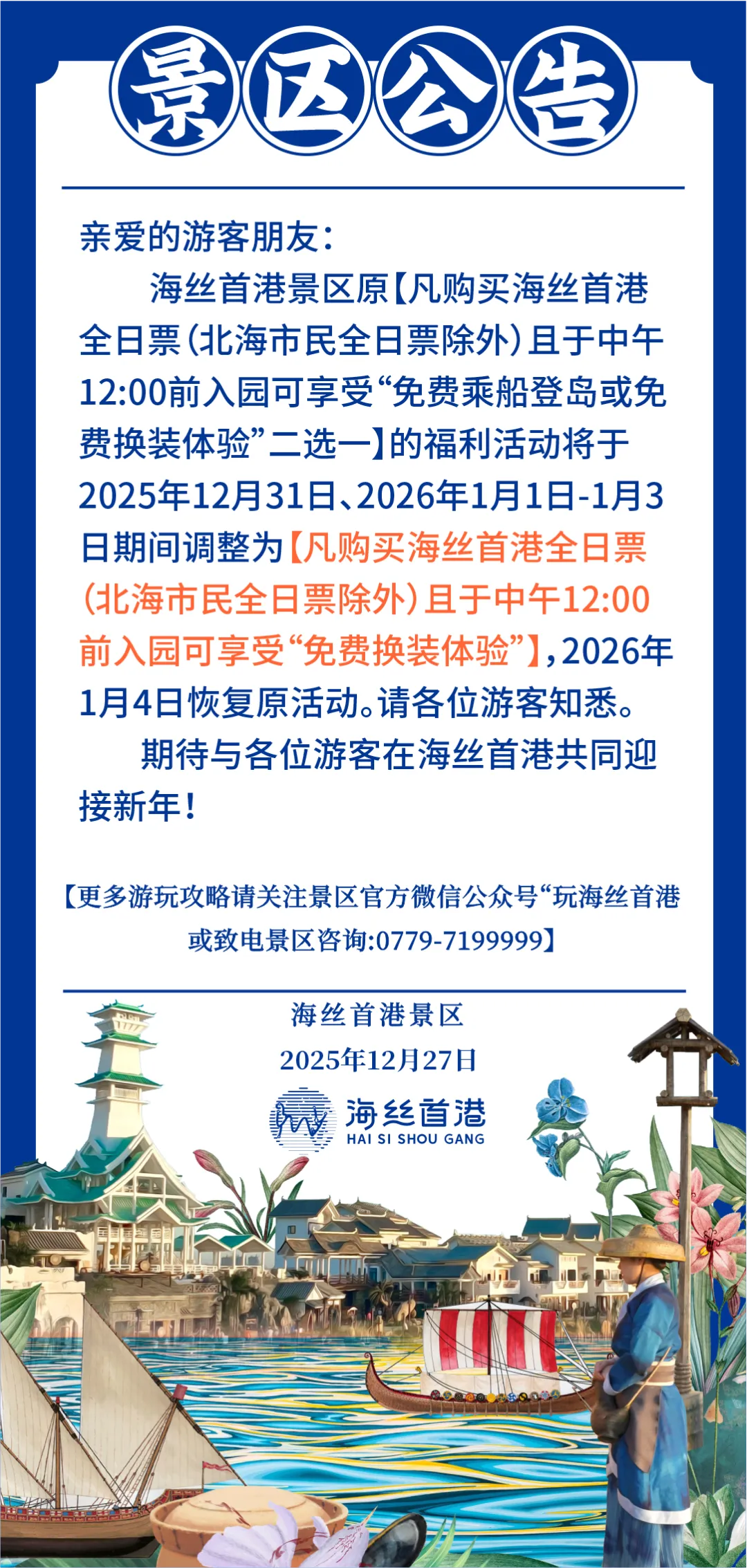 烟花庆新年,北海合浦夜空即将被点亮! 12月27日,海丝首港年度巨制—— 元旦跨年百万烟花剧《向海之路》 将迎来首演实测! 这不是普通演出 而是北海罕见的大型实景烟花剧场 融合戏剧、光影、烟花与千年海丝文 只为打造一场超越想象的跨年盛宴 • 广西首个海上烟花实景剧 三场烟花贯穿夜晚,从《暮色霞光》的温柔,从《盛世首港》的辉煌,再到《向海之路》的磅礴,每一帧都是视觉大片。 • 实景沉浸式剧情体验 不止是“看烟花”,更是“走进故事”。你将是古港的一员,在演员互动中穿越时空,感受千年海洋文明的回响。 • 14小时超长狂欢 从白天渔港生活体验到夜晚演艺烟花派对,一次体验,全天精彩。 ⏳ 为什么12月27日值得“抢先看”? 这是元旦跨年场的全规模实战预演,所有烟花、剧情、互动环节全部按正式规格呈现,诚意满满,效果不打折!你可以: • 抢先目睹完整版《向海之路》 • 在景区内选最佳观演位置欣赏烟花全景 • 深度参与互动,感受古港生活 • 避开元旦高峰,获得更舒适、更沉浸的观演空间。 简单说:这是性价比与体验感双双封神的机会。 🌊12月27日,我们在海丝首港等你 这不是一次普通的观演,而是一场关于海洋、勇气与文明的光影旅程。当烟花升空、戏剧展开、古港苏醒——你会明白,为什么我们愿意用一整年的期待,换这一夜的璀璨。 -THE END-
