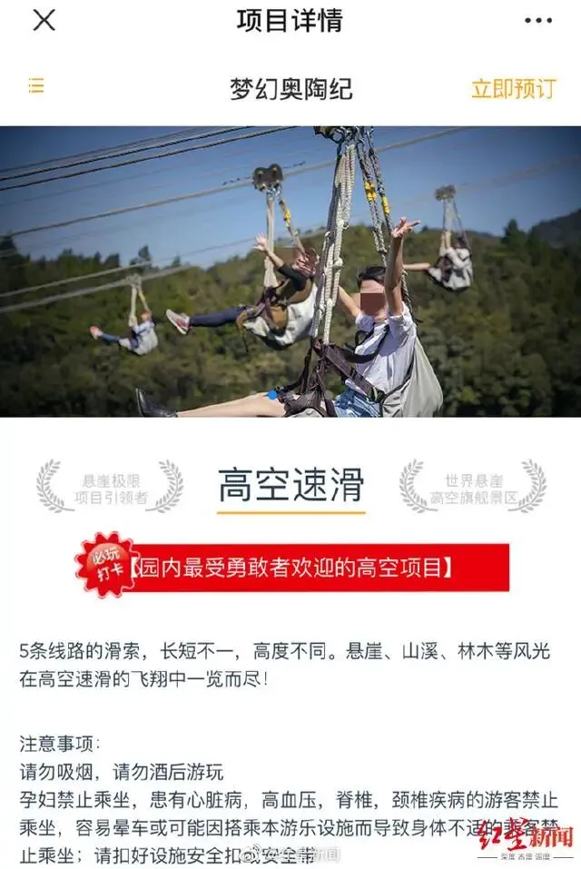 2018年,有游客在奥陶纪景区“极限飞跃”项目游玩时保险扣突然脱落。后经调查核实为工作人员操作不当,导致游客背后保险绳保险扣脱落。