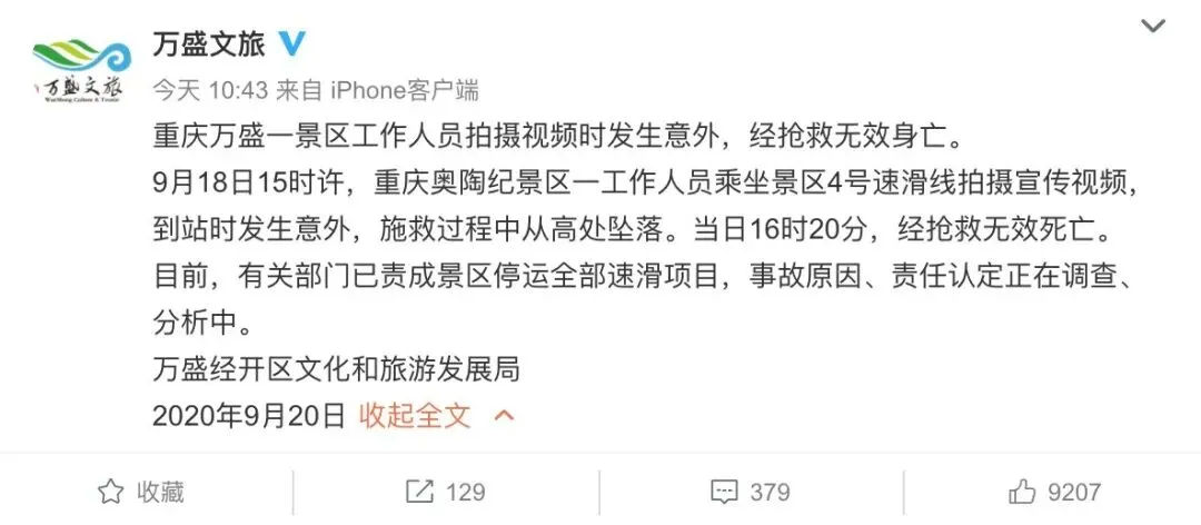 针对“重庆万盛奥陶纪景区有人从索道坠入山谷”一事,重庆万盛经开区文旅局20日发布通报称,景区一工作人员在拍摄宣传视频时发生意外,后经抢救无效身亡。目前,有关部门已责成景区停运全部速滑项目,事故原因、责任认定正在调查、分析中。