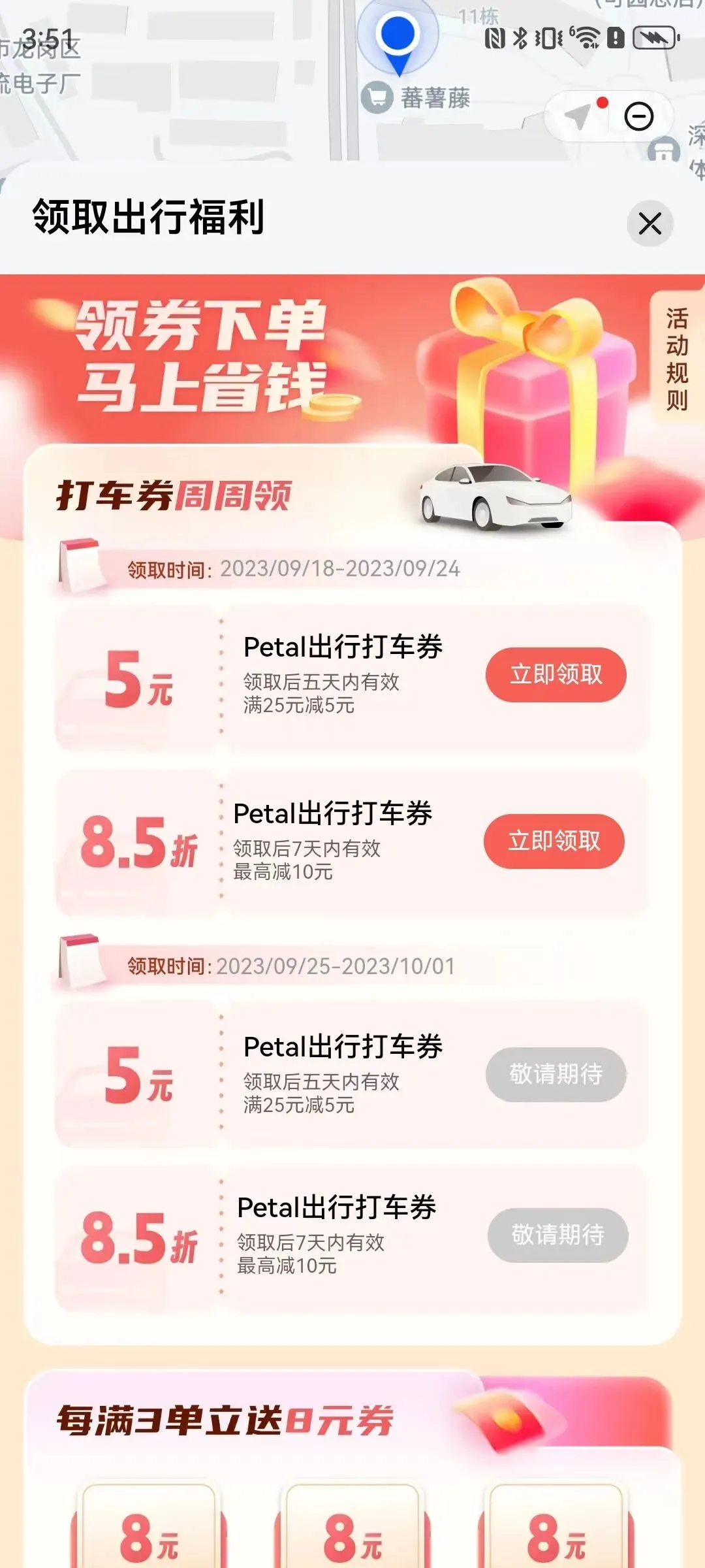 举个例子,如果要去南山一棵树看夜景。华为用户可以呼叫⼩艺说“打⻋去南山⼀棵树”,就能⾃动打开⼿机⾃带的Petal 出⾏。将Petal 出⾏卡⽚添加到桌⾯,还可实时了解⻋辆⾏程动态,等⻋时⻓、⻋辆颜⾊等信息。