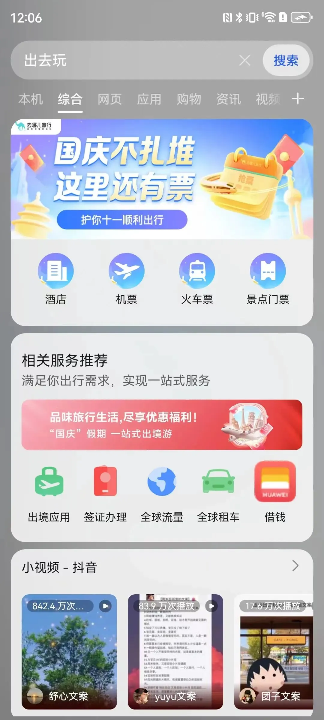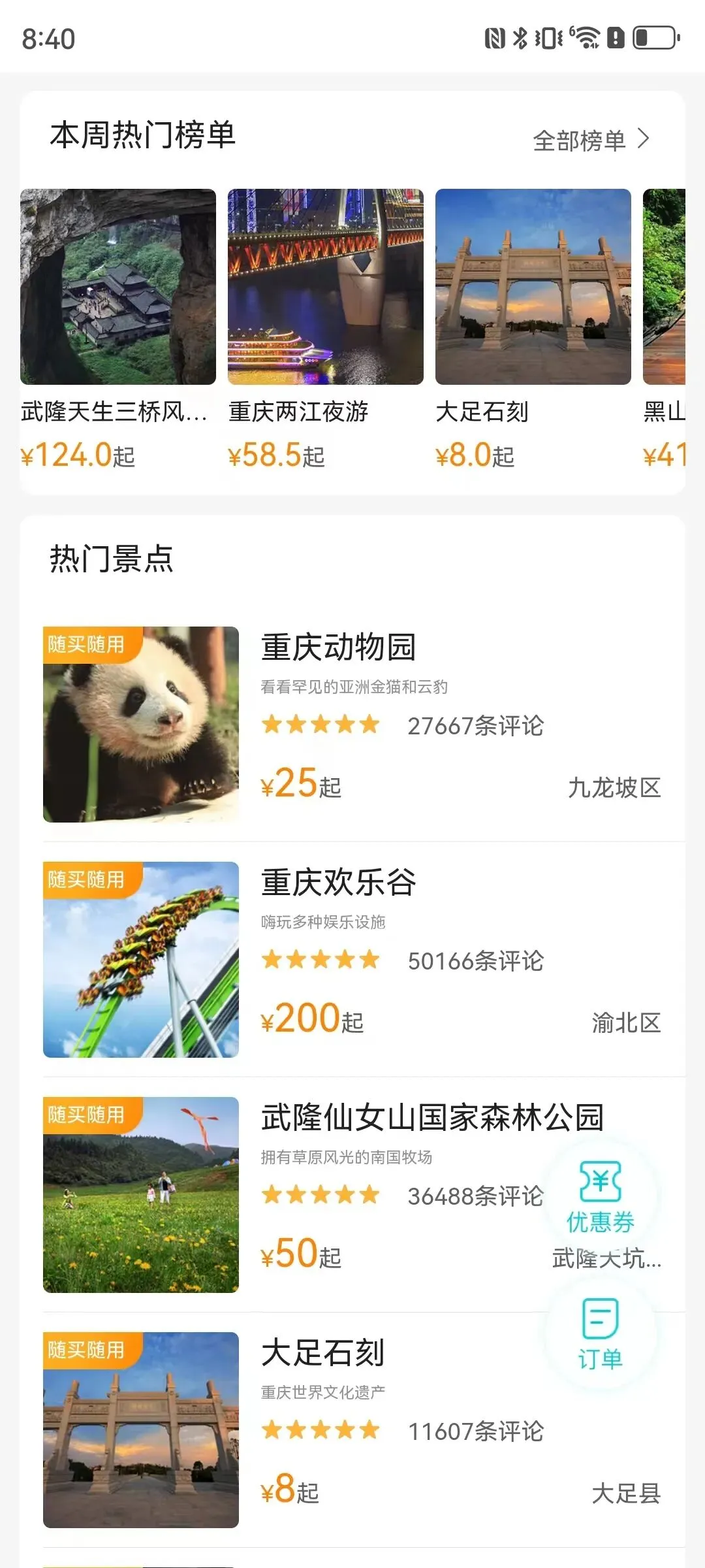 除了逛市区景点,附近一些热门的人文景区也不容错过,武隆天生三桥、佛教题材石刻大足石刻、万盛陶奥纪等都是感受山城人文特色的必打卡地,为了避免各个小程序切换买门票麻烦,潮妹建议大家通过华为手机桌面下拉,搜索“出去玩”,进入“景点门票”实现一站式购票。按操作点开后你就会发现,界面除了有各个景点门票的预订方式,还有其他网友整理发布的重庆游玩路线推荐,参考着来玩少走弯路!