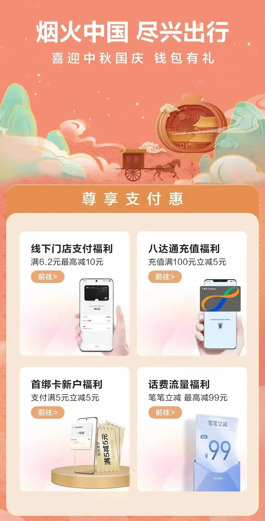 吃好的同时,省钱也不能落下!买单前唤醒小艺说“钱包包优惠”,手机界面自动打开一个福利集合页,里面汇集了各种支付优惠券和满减活动,华为用户双击电源键支付满6.2元就有随机立减优惠,zui高有机会减10元,又省一顿奶茶钱!