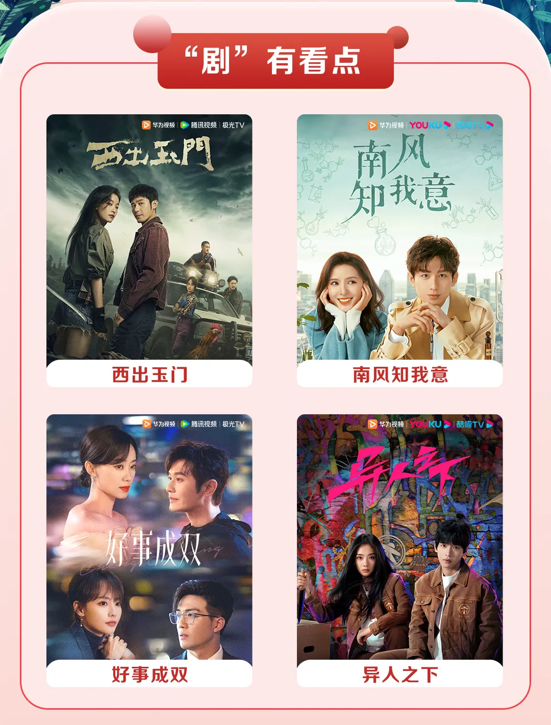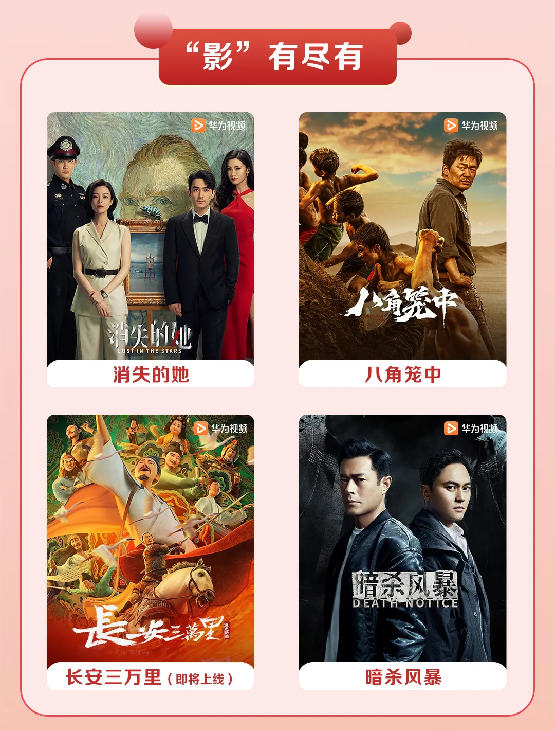除了看书以外,在悠闲的时候还可以通过华为视频追剧、看电影、综艺!华为视频⼀个App汇集了芒果TV、优酷视频、腾讯视频等平台视频资源。最近⼤⽕的综艺《披荆斩棘 第三季》《你好,星期六》电视剧《异人之下》《好事成双》《西出⽟⻔》电影《⼋⻆笼中》《消失的她》以及即将上线的《长安三万里》《巨齿鲨2:深渊》华为视频统统都有!!还有万部好莱坞大片及最新院线电影,AiMax影院集成高规格音画质标准打造影院级视听体验。国庆期间,华为影视季卡买一送一、再送3张总价值45元的AiMax观影券及抽奖赢手机等多重好礼,主打一个追剧自由!