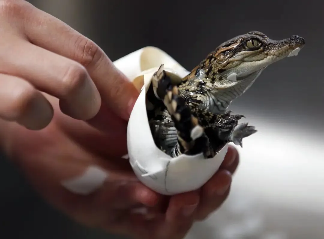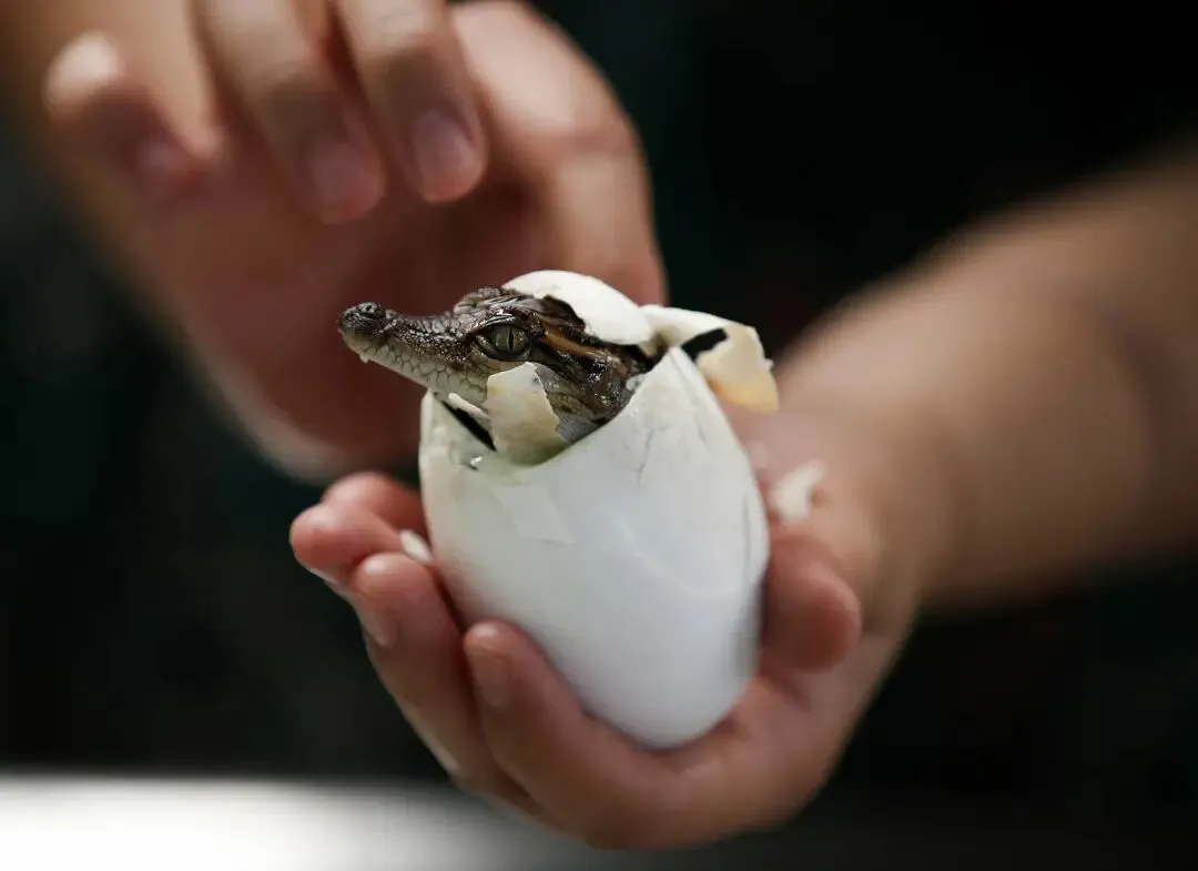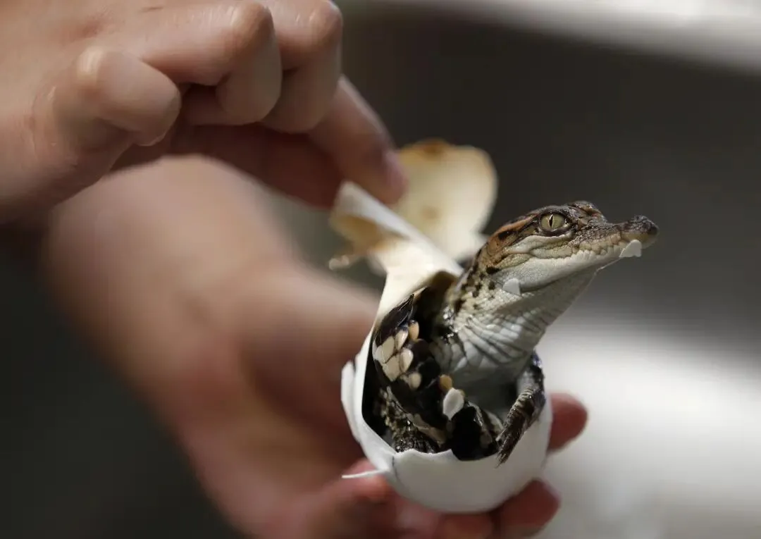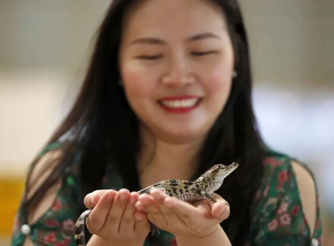 2020年6月12日,在泰国春武里府的是拉差龙虎园,一名游客捧着一只刚出生的小鳄鱼。