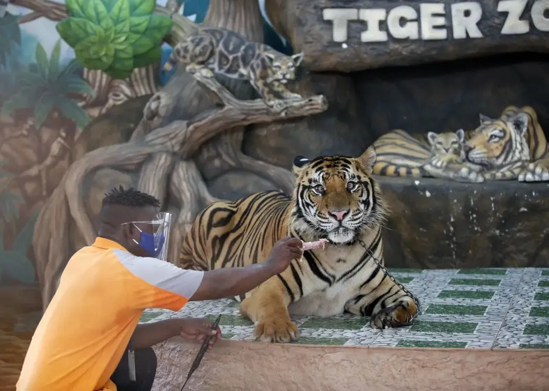 据新华社2020年6月13日报道,去年6月12日,是拉差龙虎园当日重新开放,并在当月对游客免收门票费用。 2020年6月12日,在泰国春武里府的是拉差龙虎园,游客与老虎合影。 2020年6月12日,在泰国春武里府的是拉差龙虎园,一只小鳄鱼钻出蛋壳。 2020年6月12日,在泰国春武里府的是拉差龙虎园,一名驯兽师喂食老虎。 自今年4月初,泰国新一拨新冠疫情暴发以来,超4万人感染新冠病毒,死亡病例超100例,重症病例和死亡病例都明显增加。 当地时间5月2日,泰国总理府事务部长阿努查向国家佛教事务办公室发出通知,要求全国各地寺庙配合接收新冠肺炎病患的遗体,不要拒绝为其举行火葬。同时强调火葬要与当地卫生防疫部门协作,严格执行防疫措施。对遗体进行特别防护处理,工作人员须穿防护服,并请死者家属理解和配合快速处理遗体。为防控疫情的传播,必须在1天之内完成火化,参加葬礼的人仅限亲属。 同日,泰国内政部发布公告称,随着泰国新冠疫情进一步蔓延,疫情管控再次升级,新增乌泰他尼府、乌汶府和博他仑府3个采取宵禁措施的省级单位,目前泰国共有22个府采取宵禁措施。 泰国内政部要求民众在宵禁期间遵守相关措施,非紧急和非必要情况不要出门。 当地时间5月2日,泰国病毒学专家勇在社交媒体发布贴文表示,在印度来泰人员隔离点经检查发现,在印度发现的变异新冠毒株,目前来说是一件正常的事情,所有通过正常渠道入境的人员都必须经过严格检查和隔离,感染者已经被隔离,所以病毒不会传播出去。 勇医生提醒,目前泰国最担忧的不是在印度发现的变异病毒,而是在马来西亚发现的5种新冠毒株,其中包括在南非发现的毒株B.1.351,约三分之一的马来西亚新冠病毒感染者都感染的是这种病毒,也是最有可能通过泰国与马来西亚边境进入泰国的病毒。 勇医生提醒,目前在泰国蔓延的在英国发现的变异病毒也并不是直接从英国传来的,而是通过非法越境者带到泰国境内的。呼吁政府一定要严防病毒通过边境地区进入泰国。 全球累计新冠肺炎确诊病例151803822例