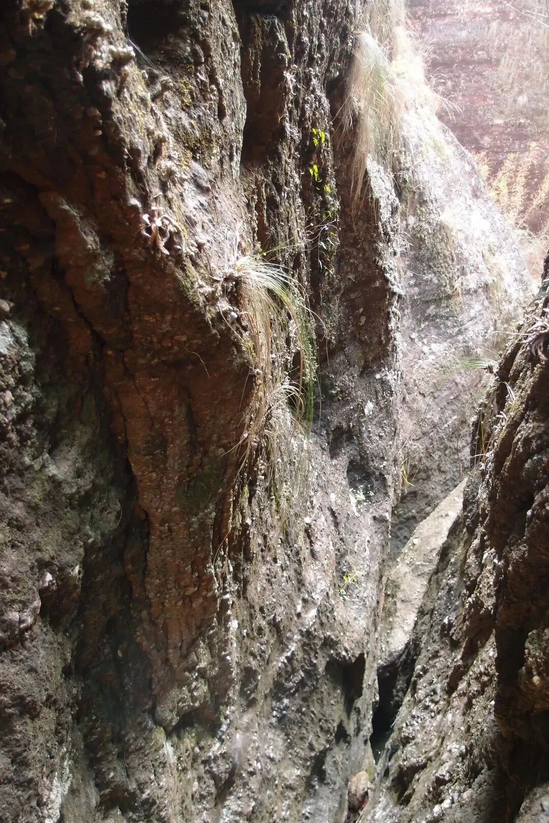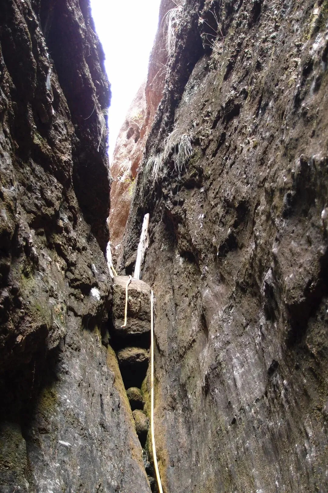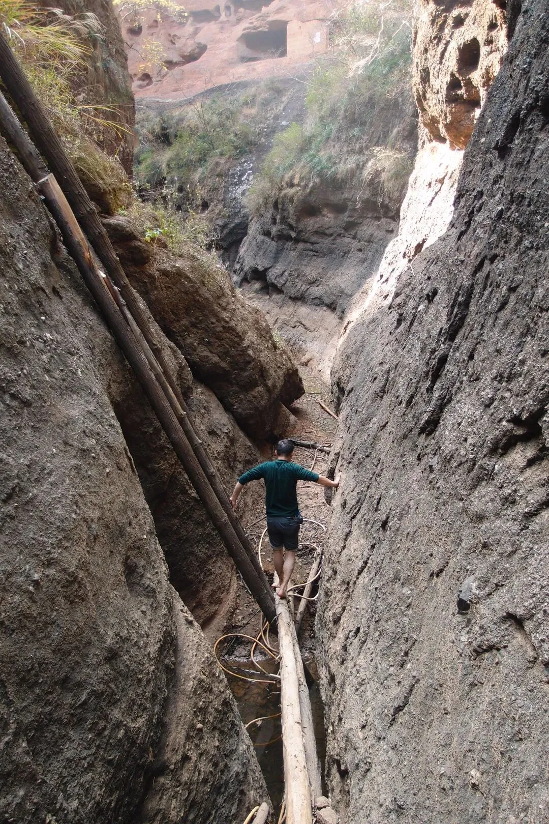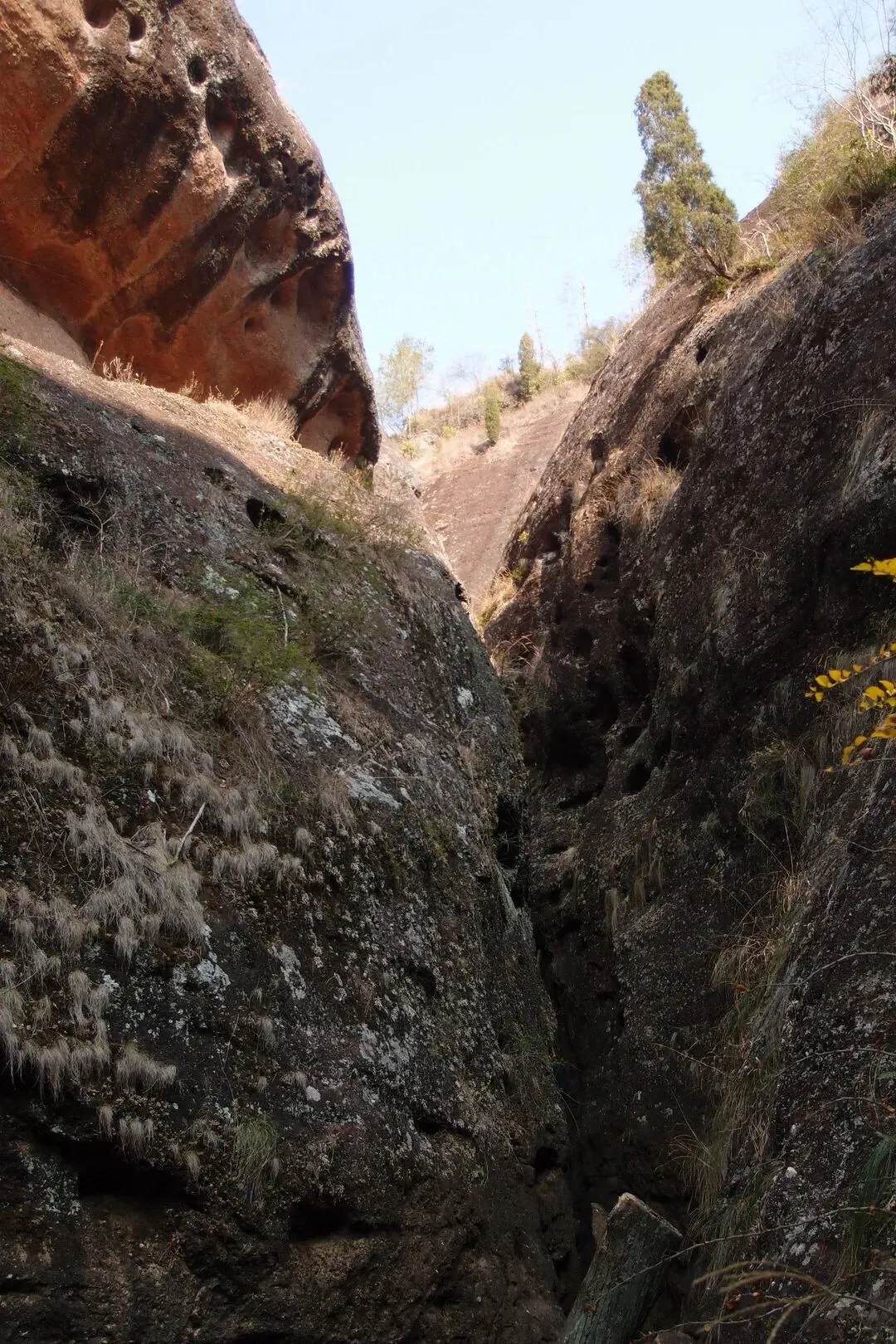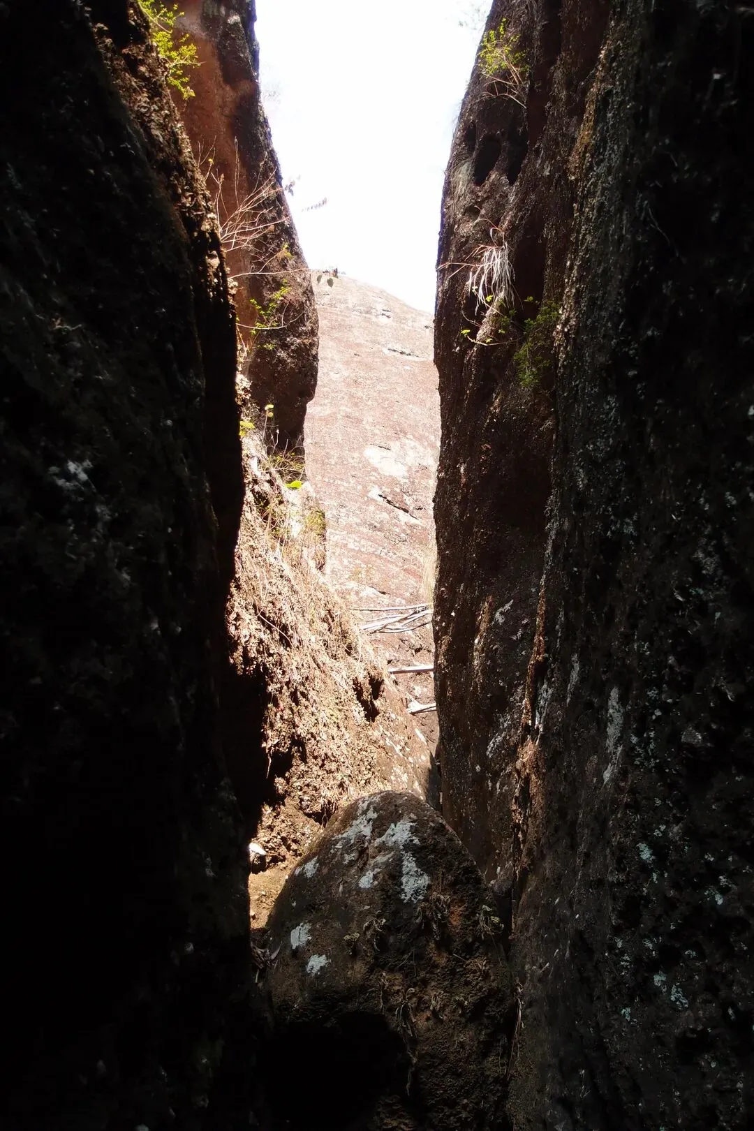 但是并没有路上去。随心找了一条岩石的狭缝处,往上攀岩,有些地方特别陡,有人固定了一根皮管,可以当绳索用。